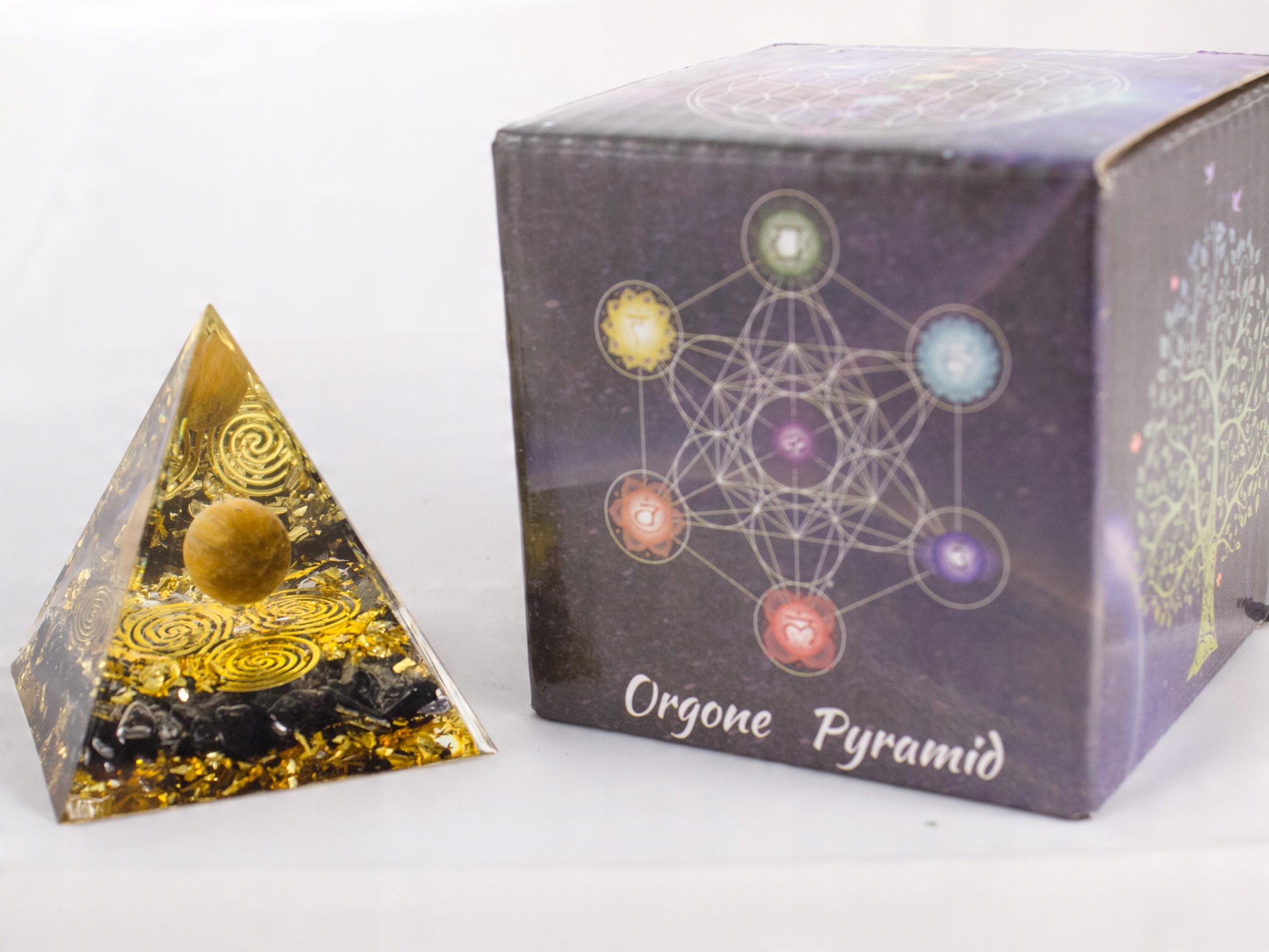 Красивая Оргонитовая Пирамида - Сфера Тигрового Глаза, красивое украшение с кусочками меди, Кристалла, Дымчатого Кварца и золотой фольги, добавляющее энергии и защиты всему телу, а также защиту от токсичных людей.