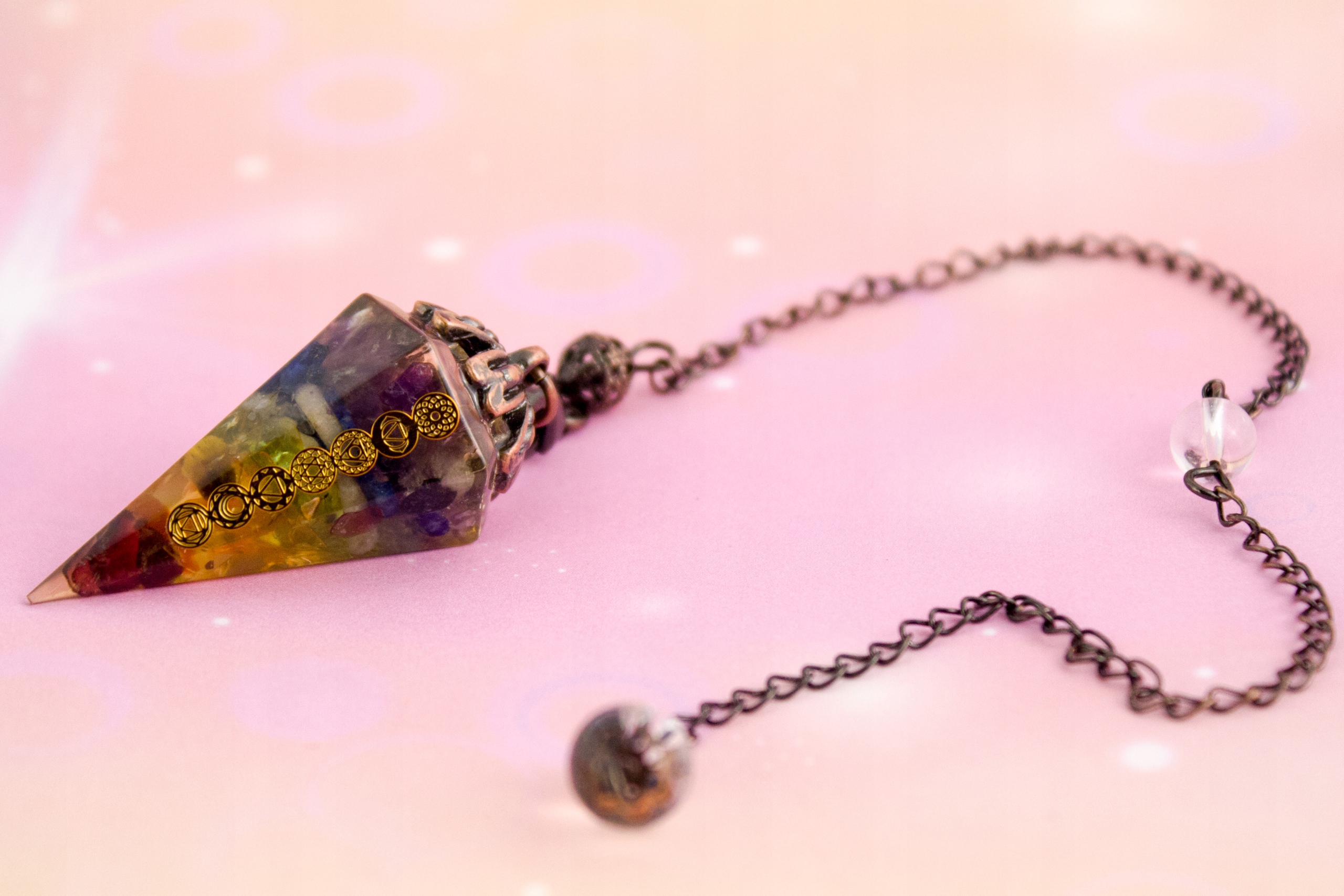 Красивый Амулет, Оргонитовый Маятник с семью разноцветными минералами и медью и 16-сантиметровой цепочкой с мелкими звеньями - действие на все 7 энергетических центров, чакр!! !