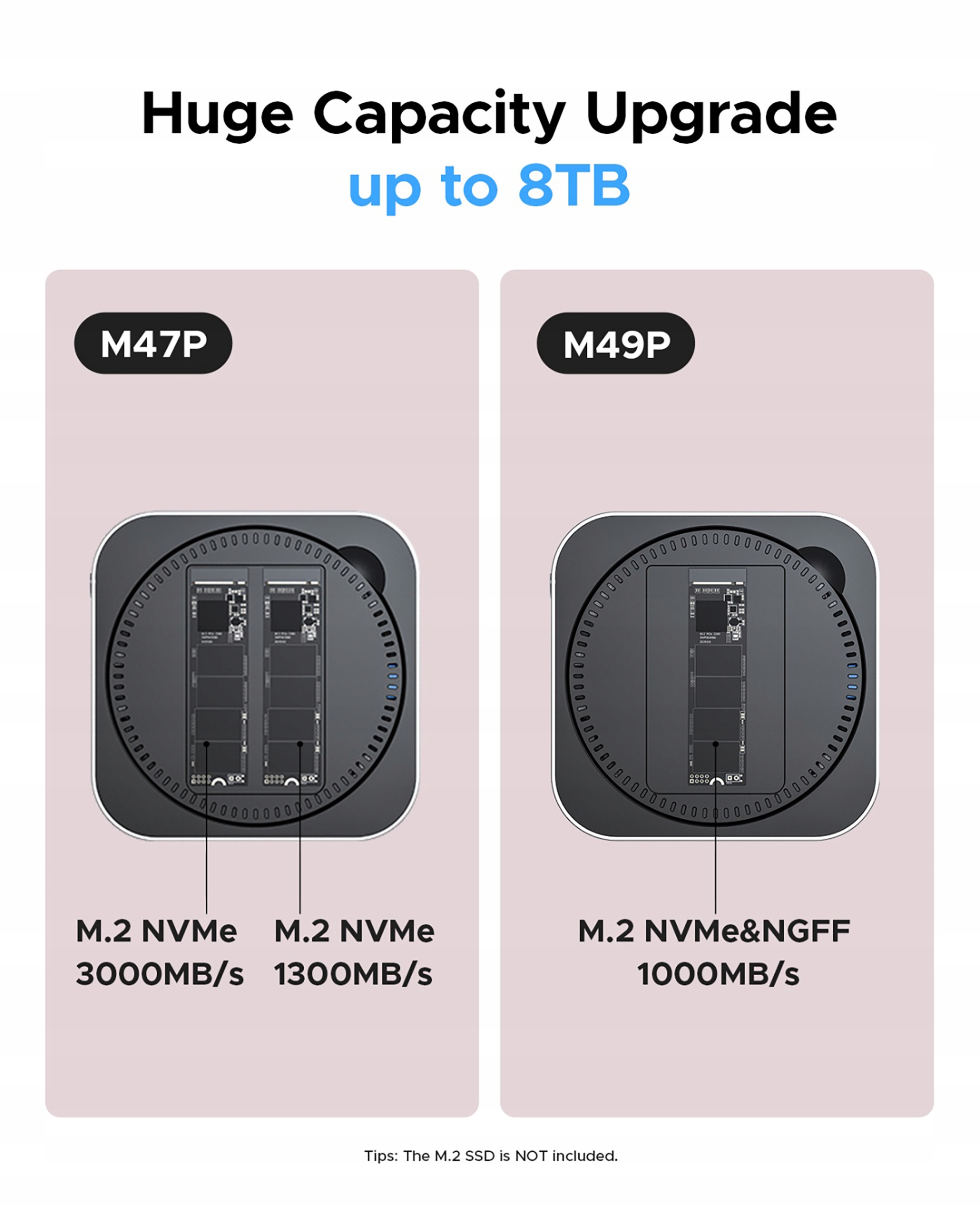 Docking Station Orico M47 имеет два слота M.2 NVME PCIe. Один из них со скоростью до 3000 МБ/с, другой - до 1300 МБ/с. Док -станция M49P поддерживает один диск M.2 SSD NVME PCIE со скоростью до 1000 МБ/с. Обе станции стыковки поддерживают дисковую способность до 8 ТБ. SSD не включены в набор.