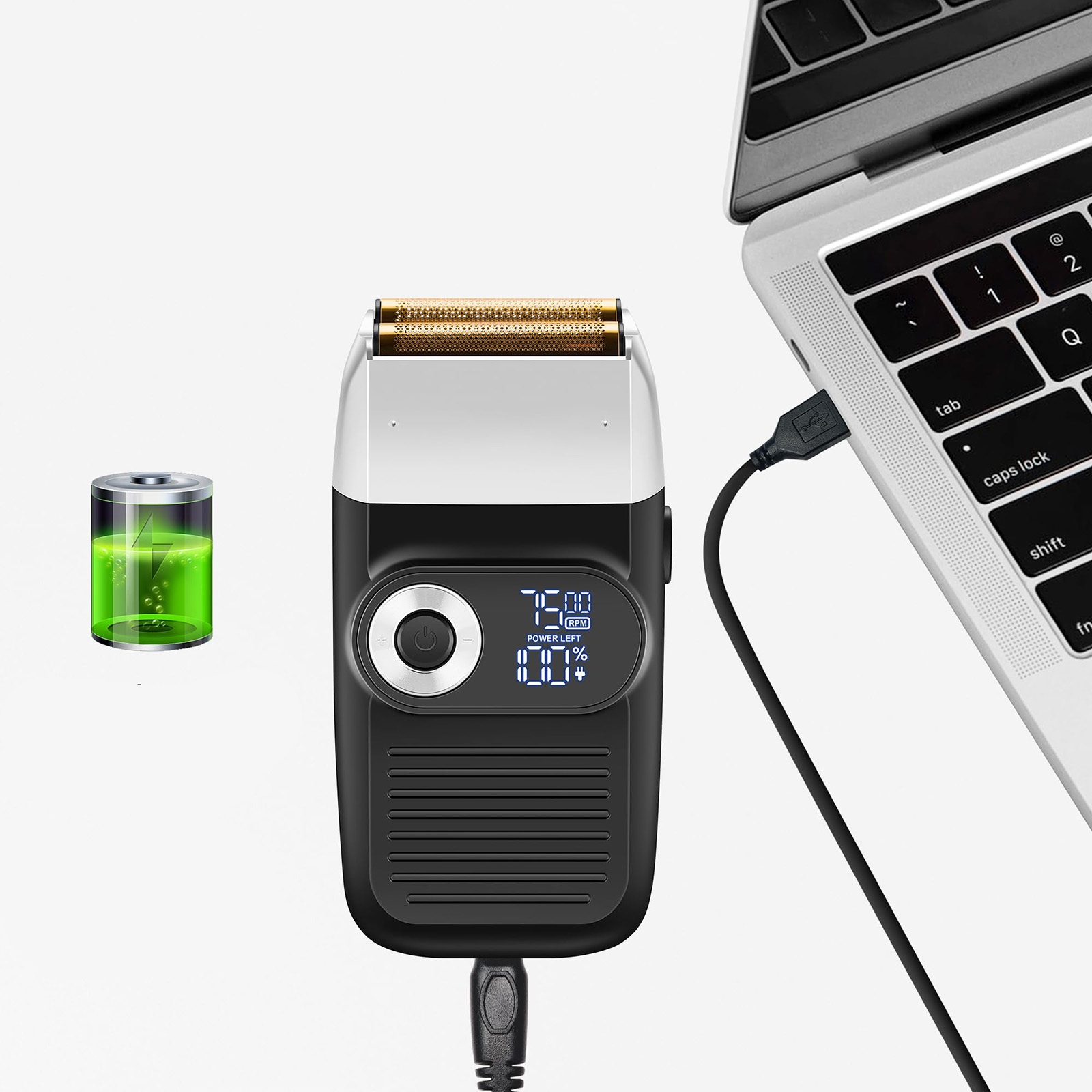 МОЩНЫЙ МОТОР И БЕСПРОВОДНОЕ ИСПОЛЬЗОВАНИЕ: Скорость этой электробритвы для мужчин можно регулировать в пределах 65, 70 и 75 об/мин. Полного заряда через 2 часа хватит на 120 минут работы. Его можно использовать во время зарядки с помощью USB-кабеля, и существует множество способов зарядки. Вы можете использовать любой адаптер, например адаптер для телефона или портативное зарядное устройство.