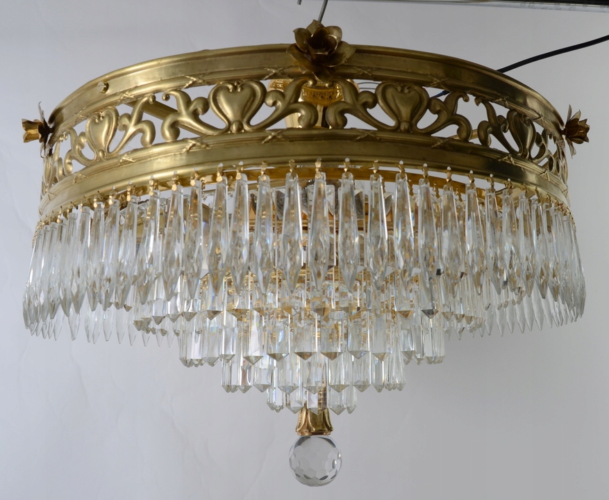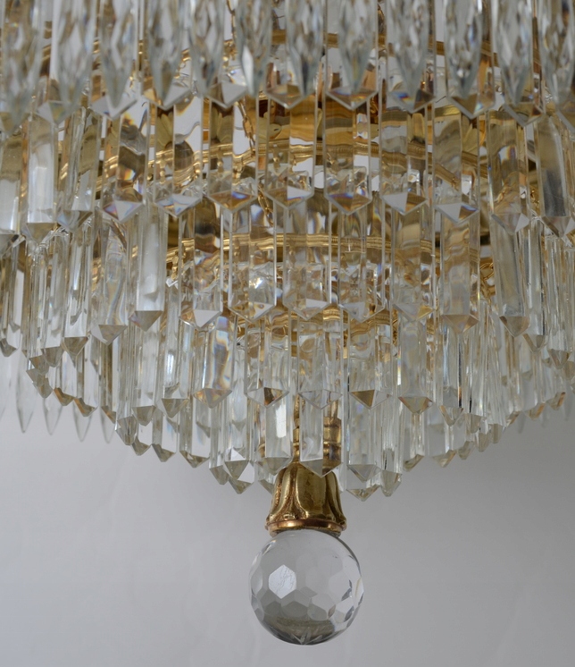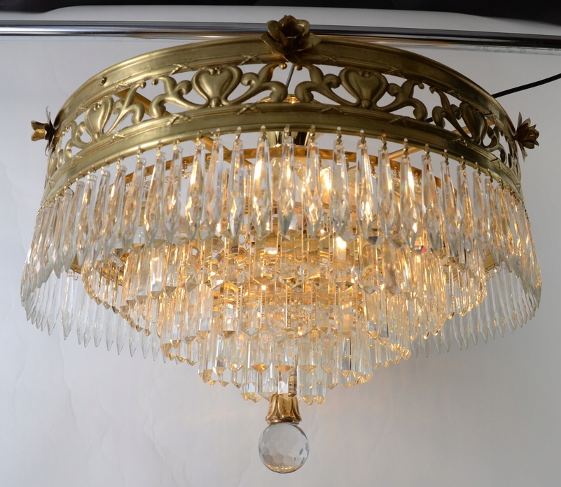 Ослепительный светильник с кристаллами родом из Испании. Он богато украшен красивыми блестящими стеклянными кристаллами, расположенными каскадом. Обручи изготовлены из латуни золотого цвета. Люстра – настоящий экземпляр, ее неповторимый внешний вид непременно вызовет интерес каждого гостя. Благодаря большому количеству блестящих стеклянных кристаллов свет прекрасно рассеивается, придавая помещению потрясающий эффект радуги. Дополнительным декоративным элементом является оригинально оформленный основной обруч. Эта ослепительная люстра украсит любую большую комнату, привлекая внимание и радуя наблюдателей. Эта необычная люстра хорошо впишется в элегантную гостиную или холл, придав интерьеру роскошный характер. Вещь выглядит великолепно! На самом деле, это выглядит еще красивее. Идеальный светильник для любой большой гостиной и т. д. – он добавит им элегантности.