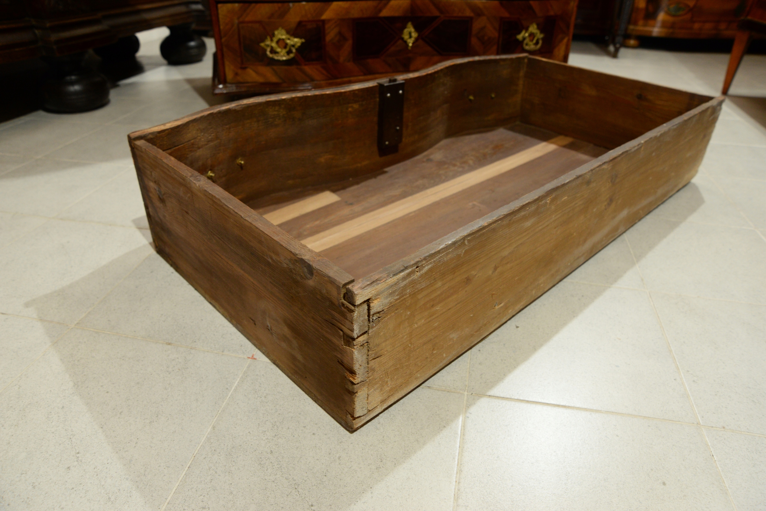 - маркетри видно на лицевых сторонах ящика и сверху.