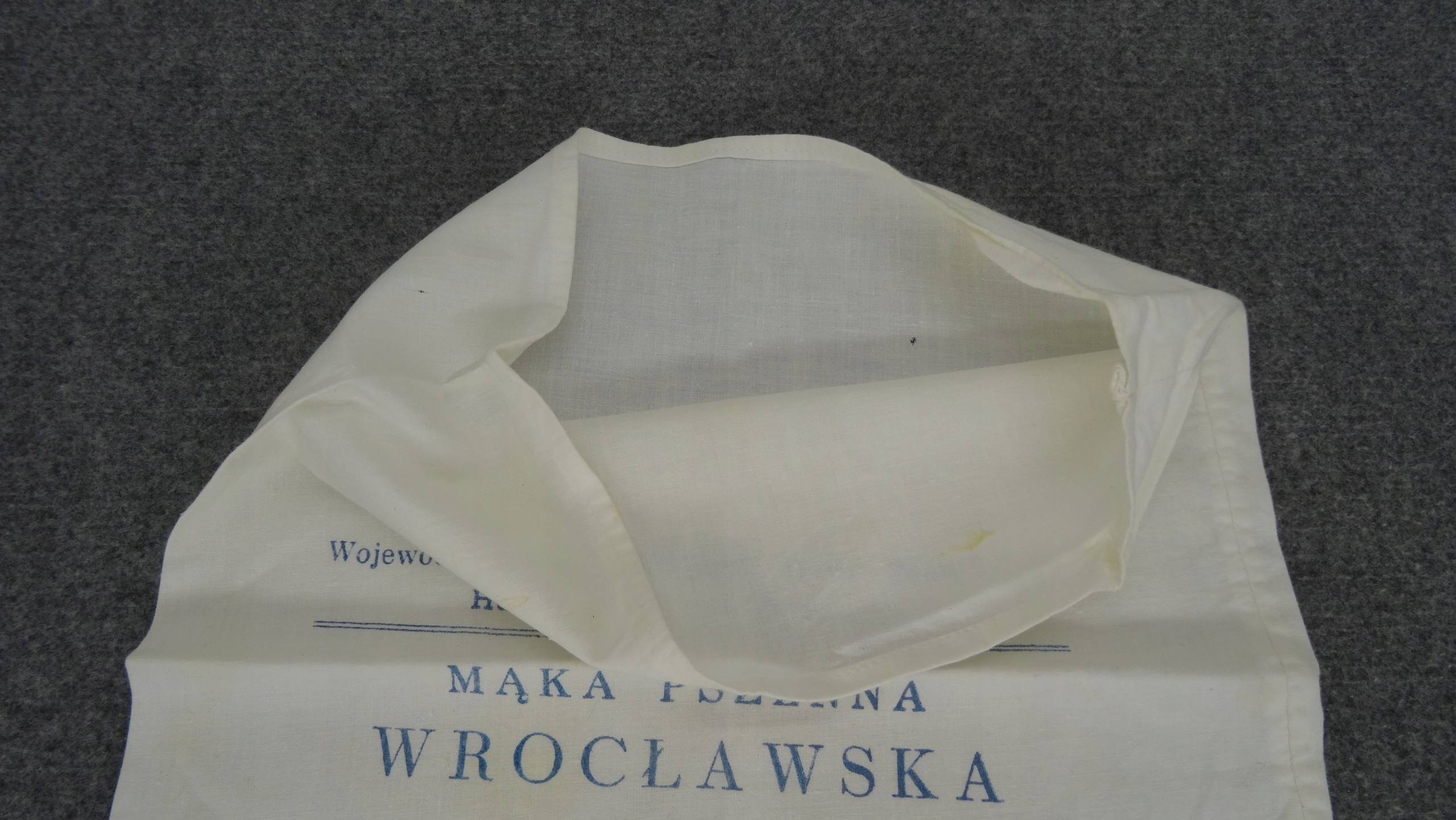Старая сумка времен Польской Народной Республики с вроцлавской пшеничной мукой. Губернское предприятие оптовой торговли продуктами питания №2 в Варшаве. На пакете печатные надписи - "Спрашивайте сыпучий и фасованный товар во всех государственных магазинах и кооперативах. Гарантия высокого качества и веса нетто"