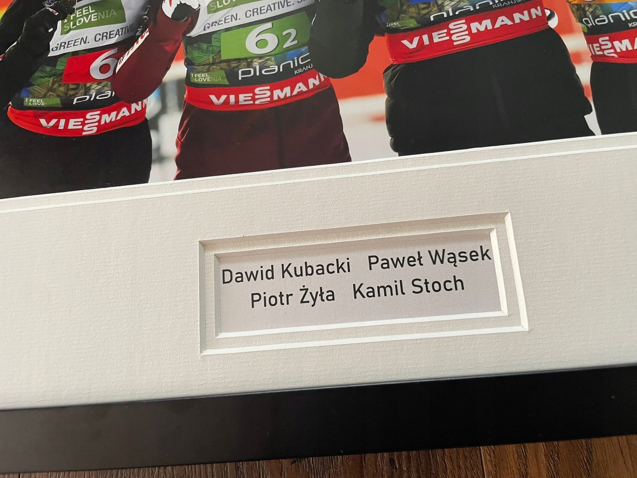 На продажу я предлагаю оригинальную фотографию с автографами наших мастеров - Камил Стох, Пиотр Жила, Давид Кубаки и Павес Веска. Это уникальный набор подписей, которые навсегда отмечают золотую эру польских лыжных прыжков.