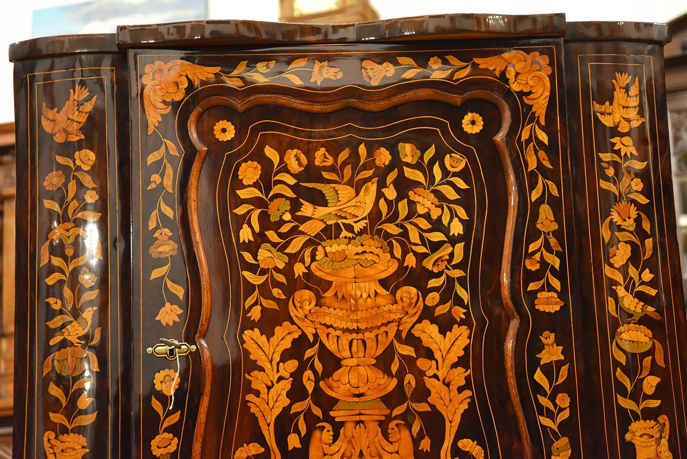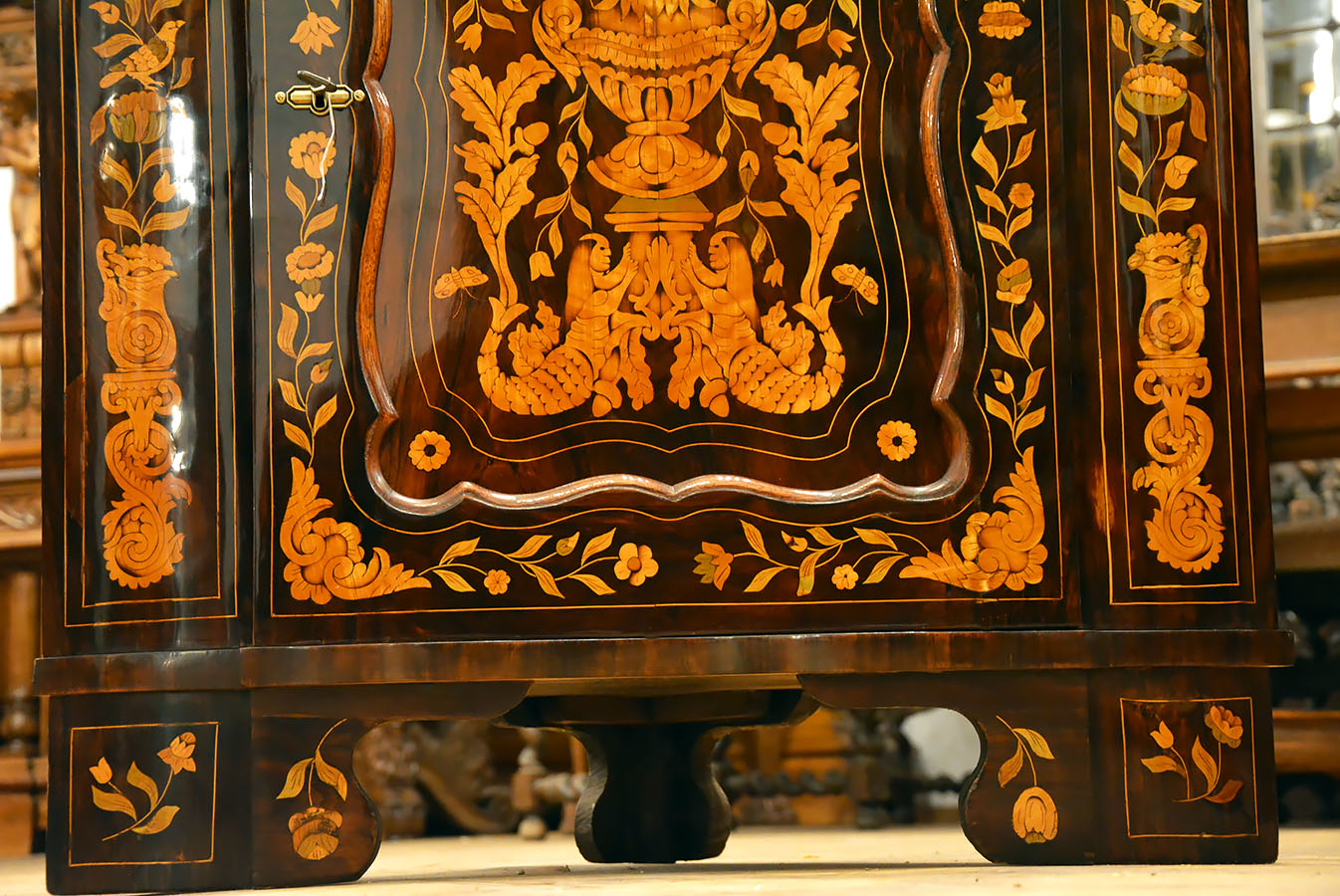 Двери шкафа невероятно богато инфицированы древесиной. Целое облицовано Палусандером, поверхности, покрытые рамами и золотой линией. Двери, наполненные узорчатым шпоном, дополнительно приняты с инкрустированными цветочными вазами, фантастическими существами и птицами. Пожалуйста, обратите внимание на точность дизайна! Также богато внутри. о мастерстве художника, который спроектировал и выполнял его, показывает деталь расположения внутриисессии B> Отличный и практический дополнение к каждой комнате, для вставки и использования. >