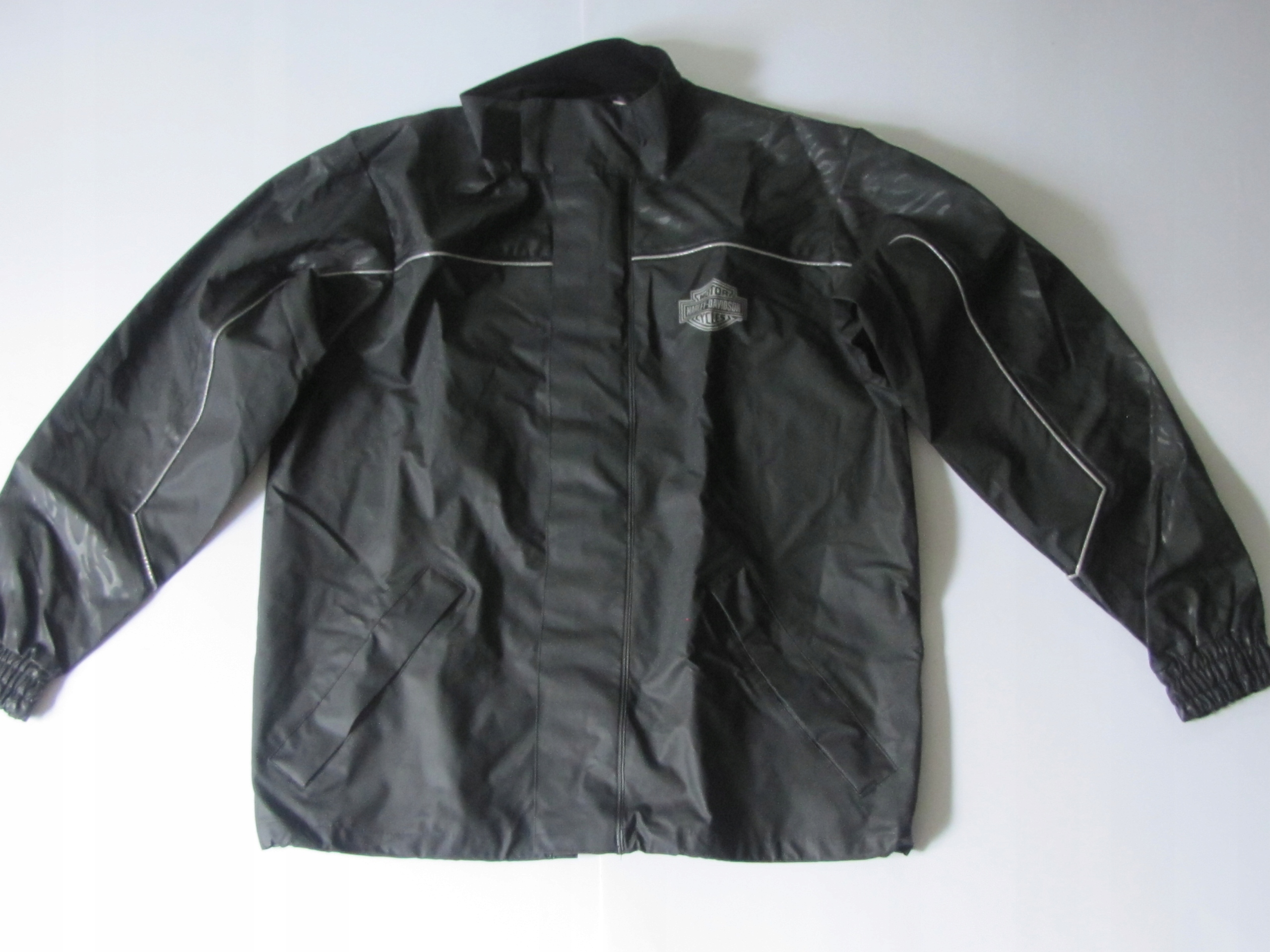 Оригинальный Harley Davidson, дождевик. Костюм имеет переднюю молнию, а также застежку-липучку спереди. Карманы на ногах и логотипы на груди спереди и сзади. Обратите внимание, что логотип на спине и белые вставки на костюме светоотражающие!