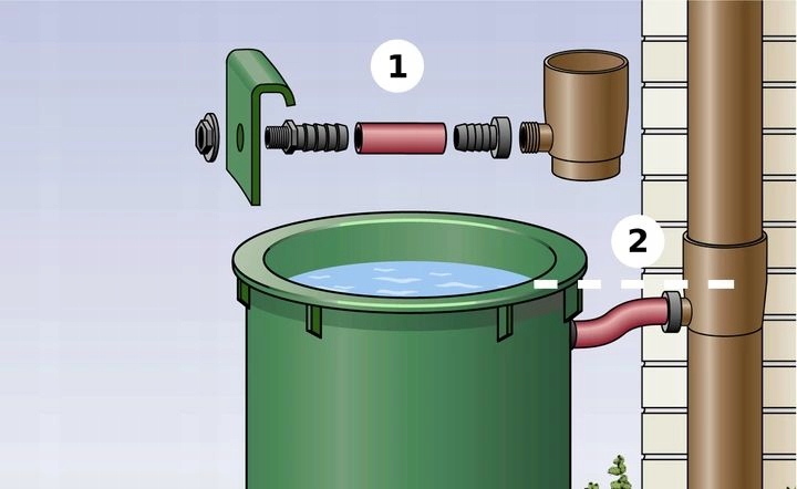 Водосборник собирает дождевую воду из водосточной трубы до тех пор, пока вода в резервуаре не достигнет уровня, на котором установлен коллектор. Избыток стекает дальше через сливную трубу.