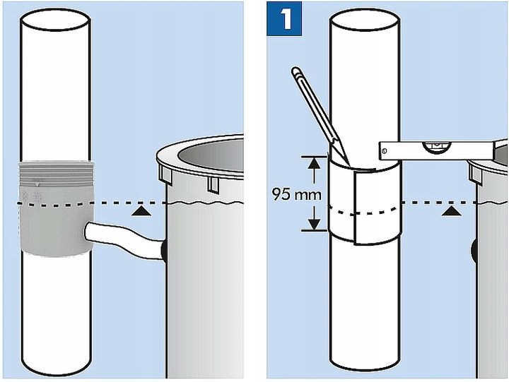 1. Отметьте верхний край коллектора дождевой воды на водосточной трубе на 95 мм ниже 2-й отметки.
