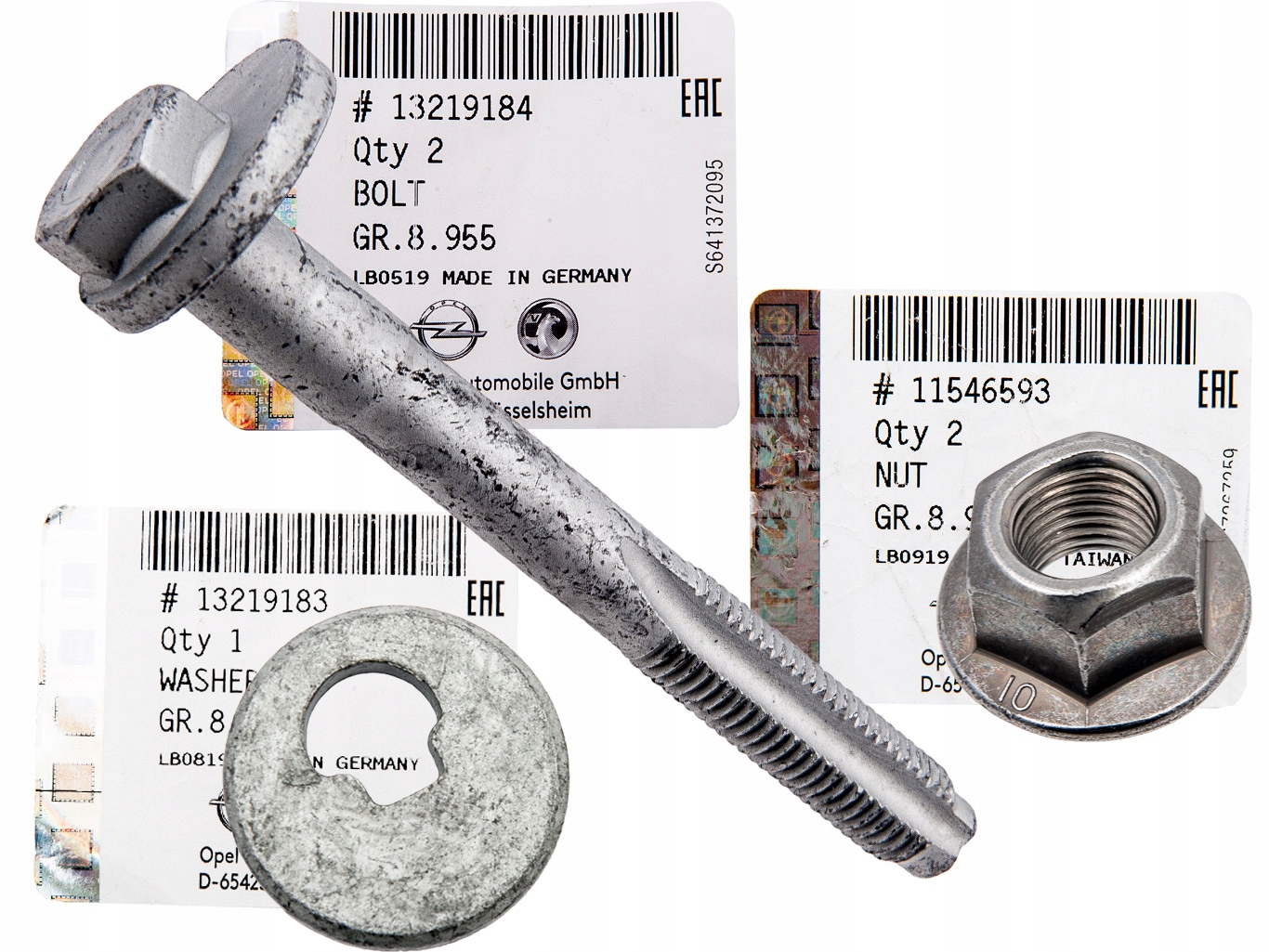 Оригинальный эксцентриковый винт в комплекте с оригинальной шайбой и гайкой заднего нижнего поперечного рычага