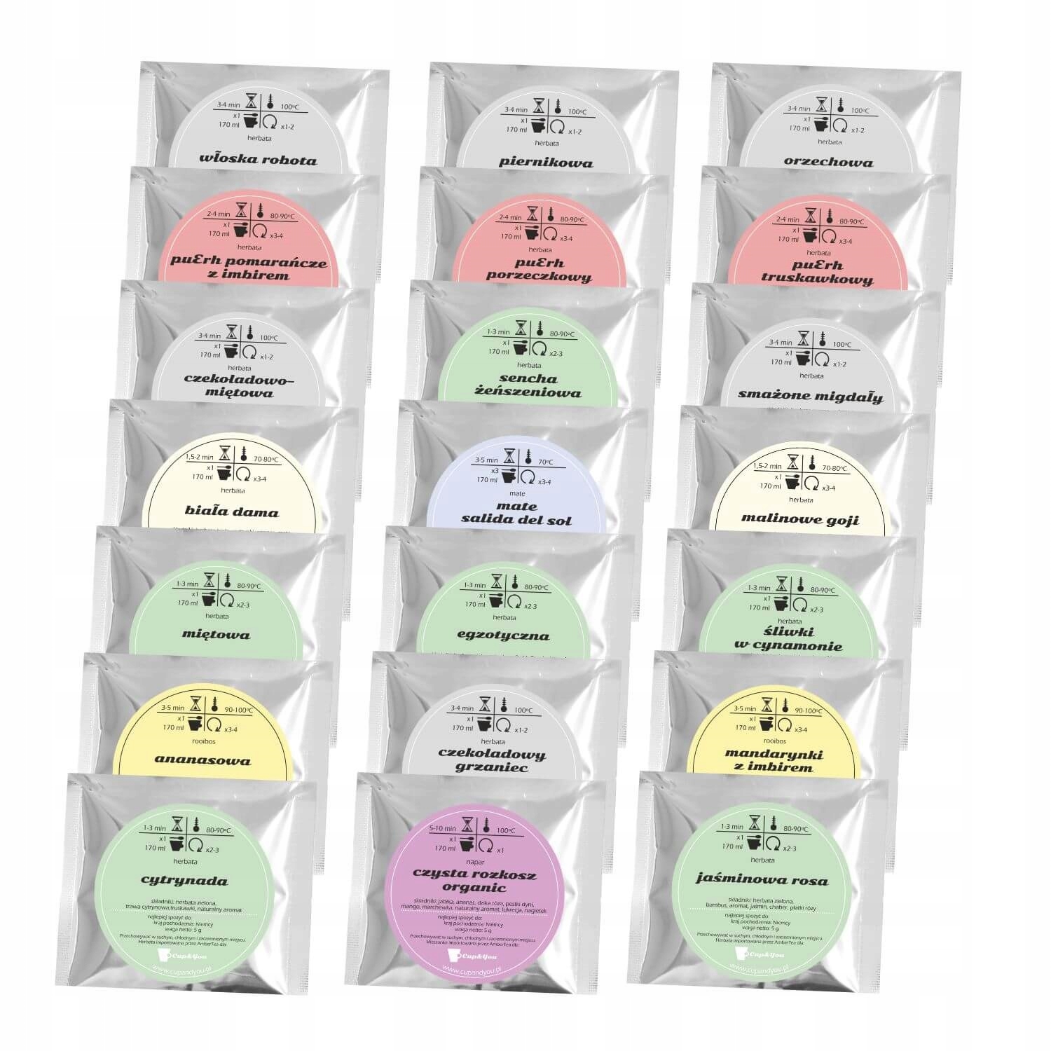 - Каждый чай упакован в отдельный пакетик с подробной описание и инструкция по завариванию,