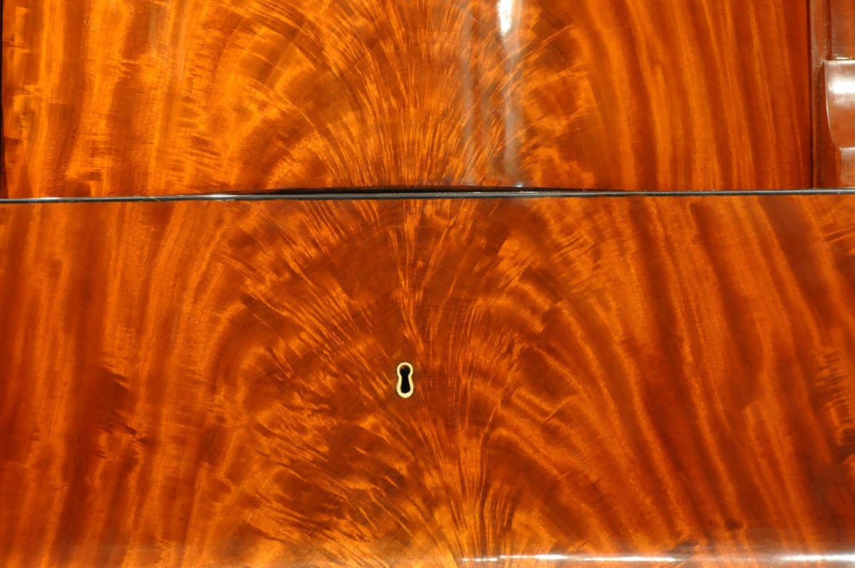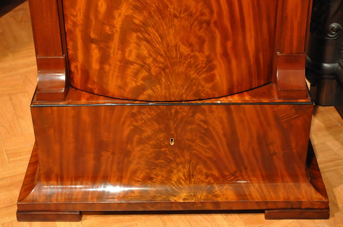 Интересная и редкая форма мебели, овальная лицо с профилированным карнизом, широкий пьедестал. Закрыт с однолистными дверями, полностью визуаливыми пирамидальным махоном.