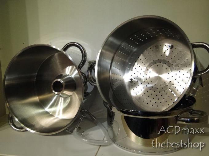 Благодаря такой конструкции кастрюлю можно использовать отдельно для приготовления пищи, сито — для процеживания, а крышку — для других сосудов диаметром 25 см.