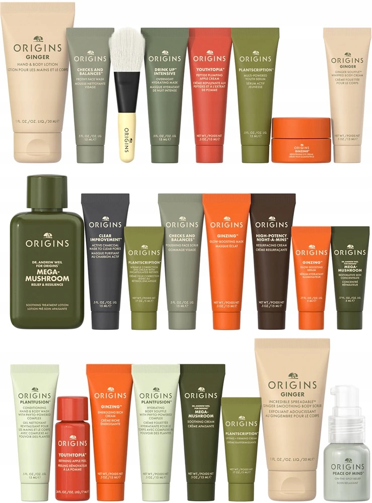 В набор входят мини-продукты Origins, в том числе маски, скрабы, дневные и ночные кремы, сыворотки, очищающие гели и бальзамы для тела. Это идеальный способ протестировать различные линии ухода и найти свои любимые продукты.