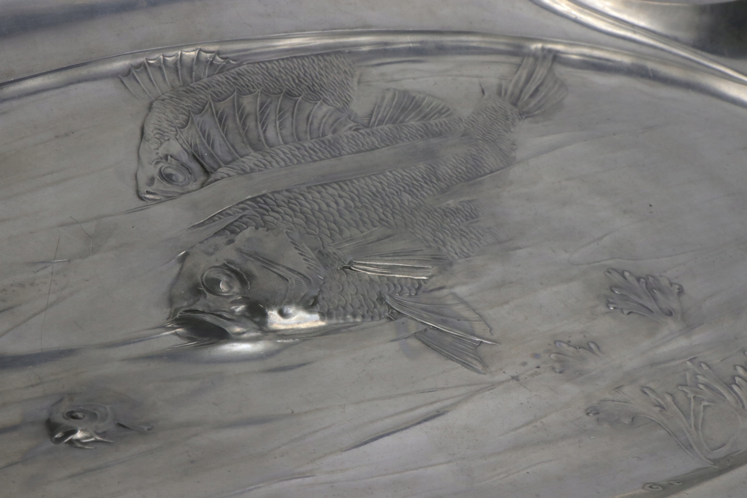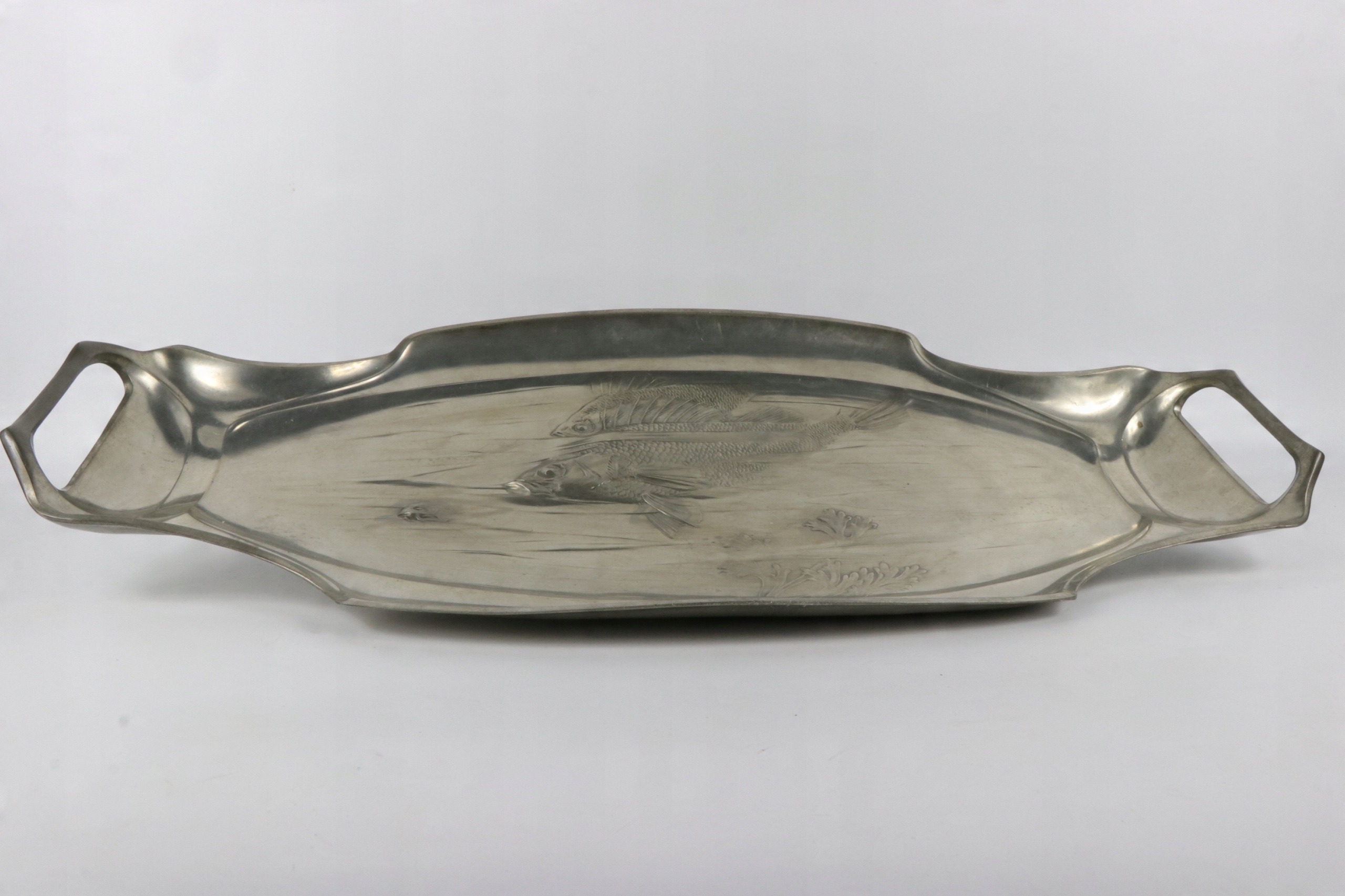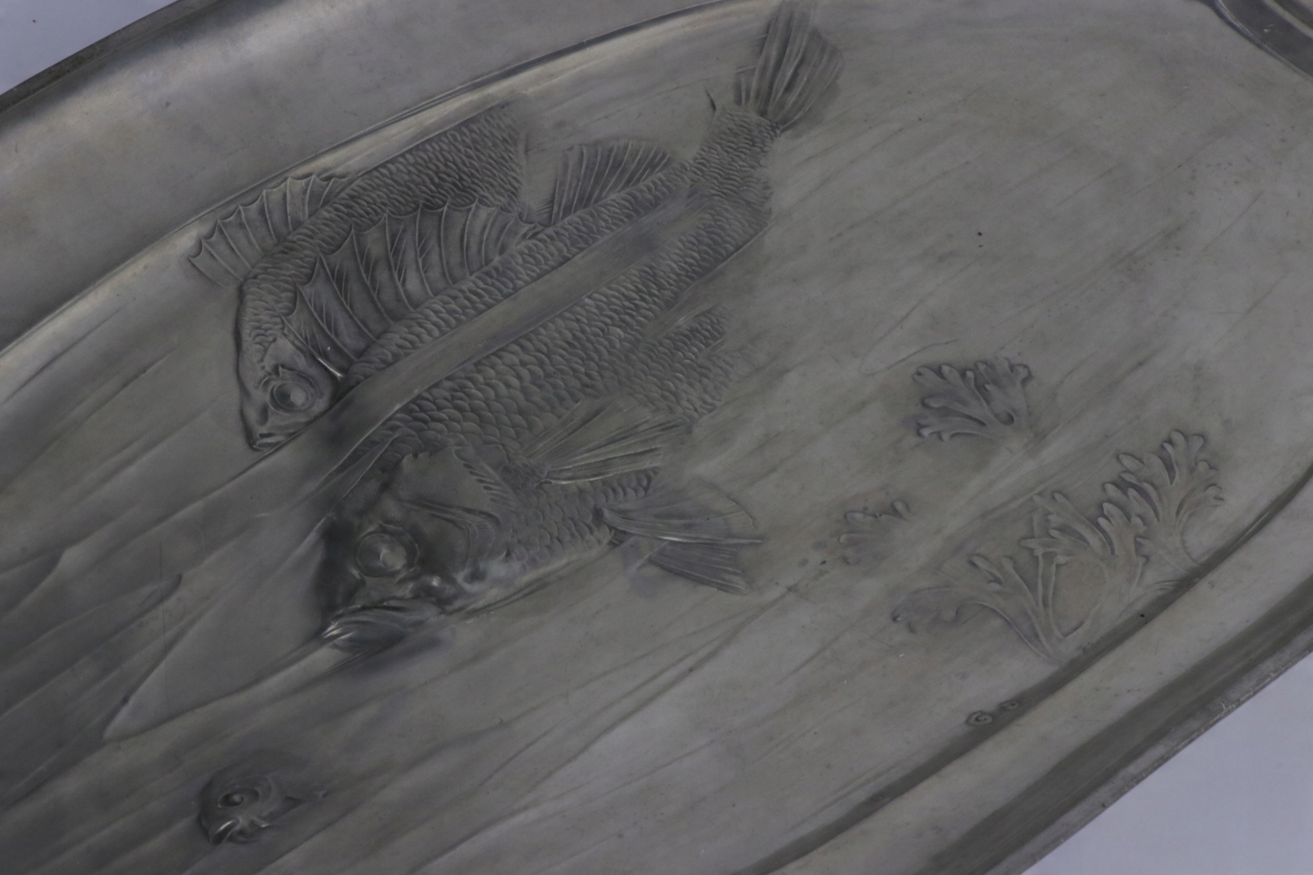 Поднос в стиле модерн в центре стола, жестяная тарелка. Предмет украшен рельефным орнаментом из рыб и водных растений. На тарелке указан каталожный номер 2655. На подносе нанесен знак OMG, знак компании Orivit, переданной WMF в 1905 году.