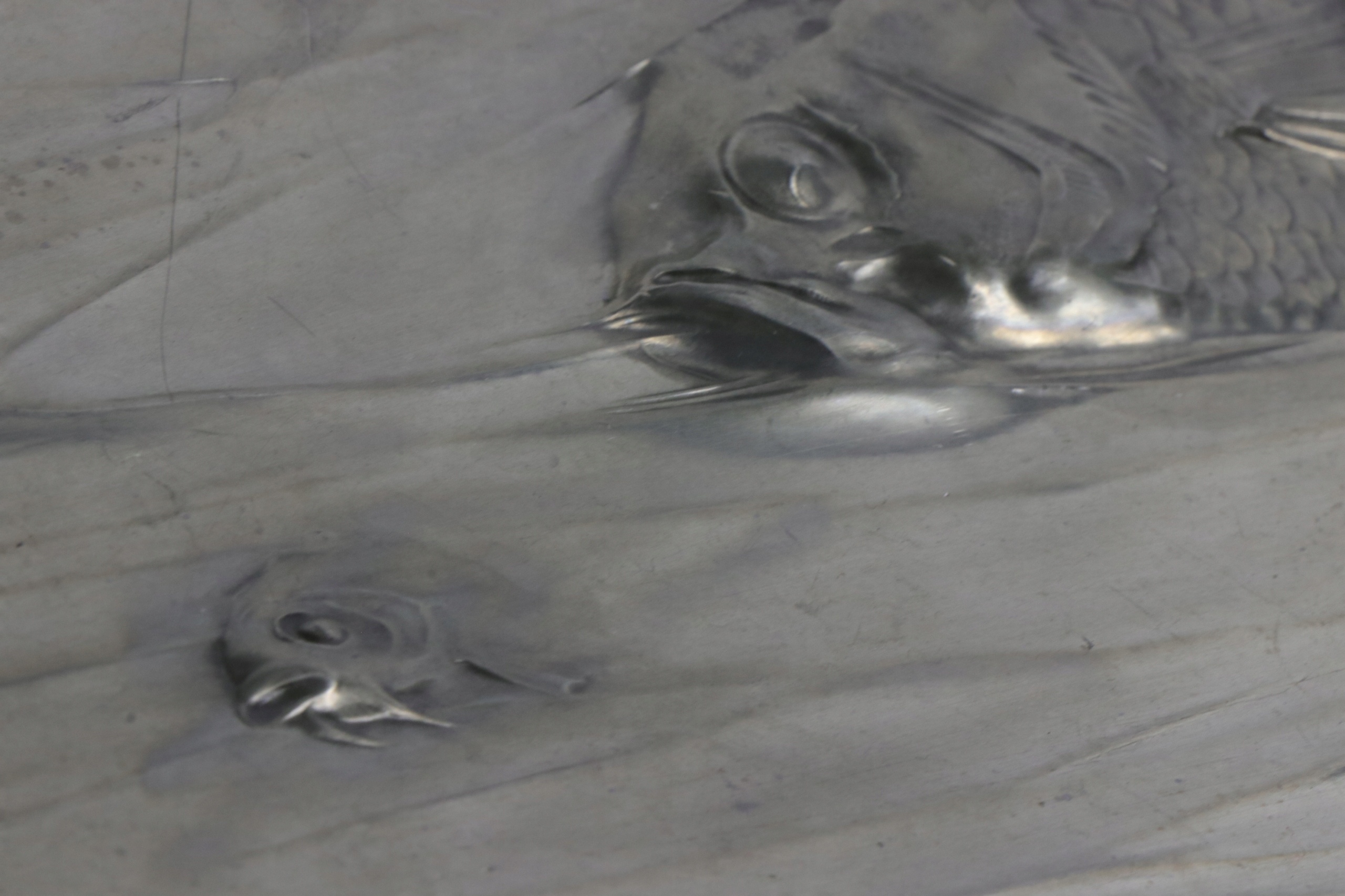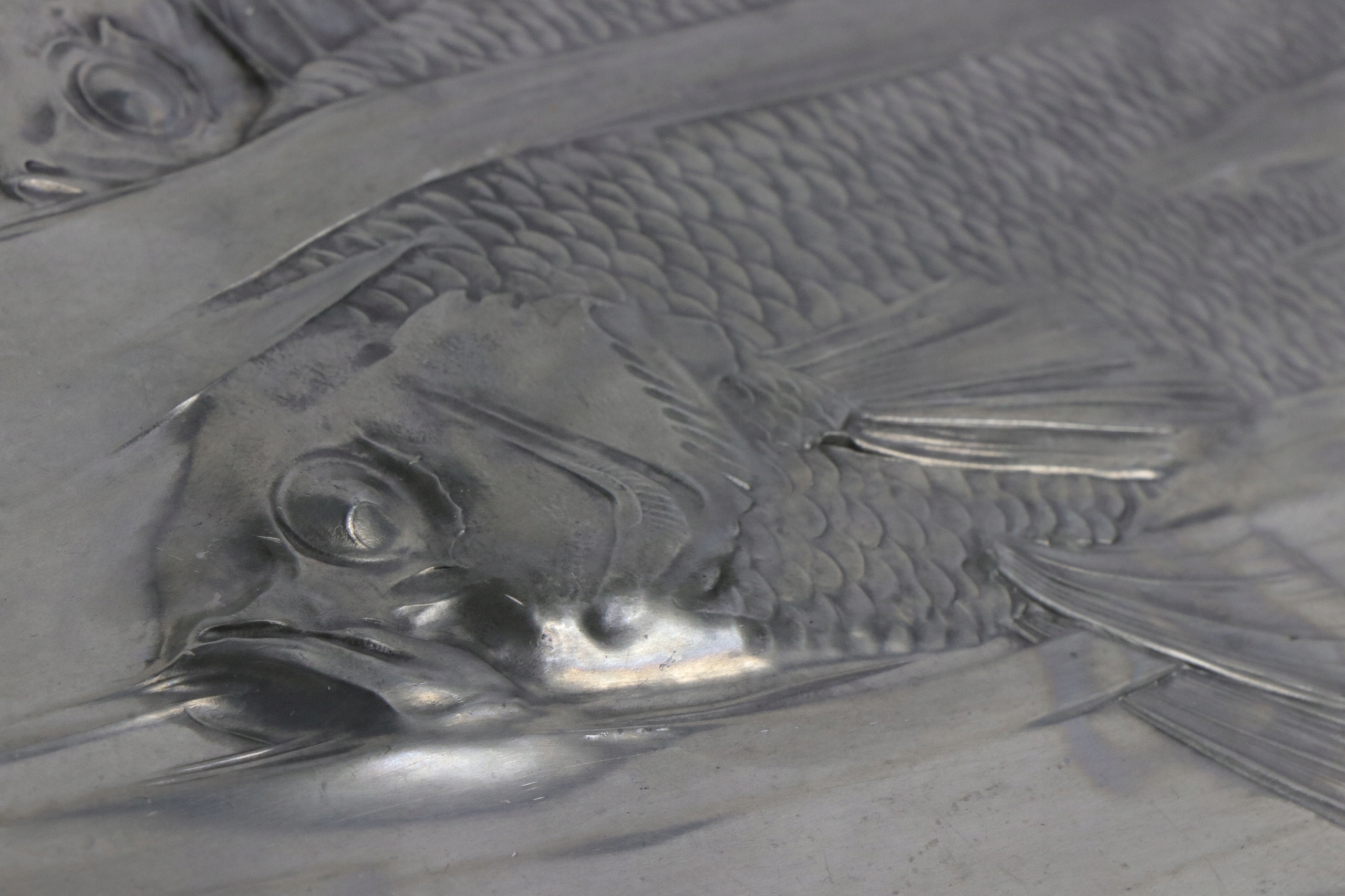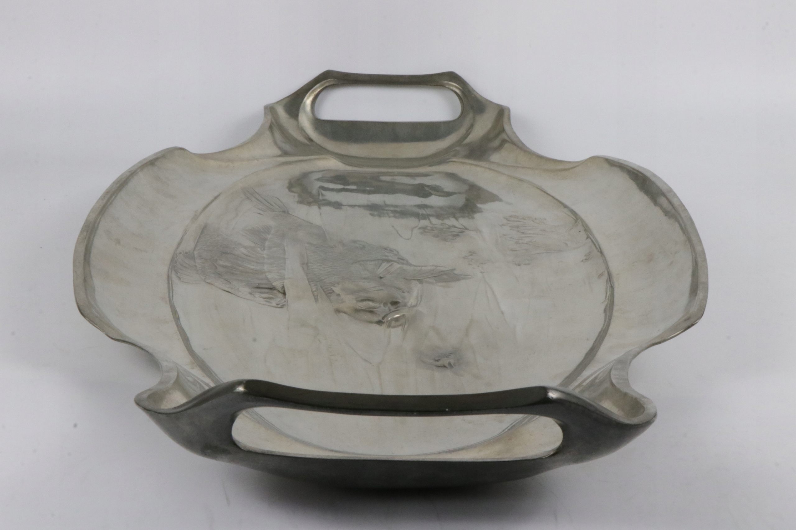 Поднос в стиле модерн в центре стола, жестяная тарелка. Предмет украшен рельефным орнаментом из рыб и водных растений. На тарелке указан каталожный номер 2655. На подносе нанесен знак OMG, знак компании Orivit, переданной WMF в 1905 году.