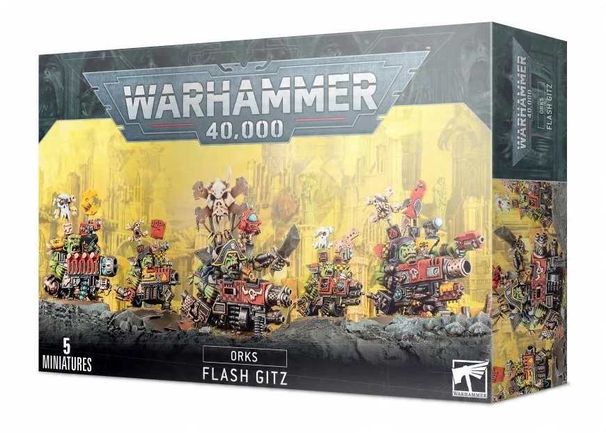 Один Flash Git может быть собран как Каптин, в комплекте с Gitfinda Squig и бионической рукой, владеющей абордажной саблей. Вы можете персонализировать свой Flash Gitz, установив на него множество дополнительных приспособлений, в том числе восемь задних баннеров, одиннадцать голов и гранаты.