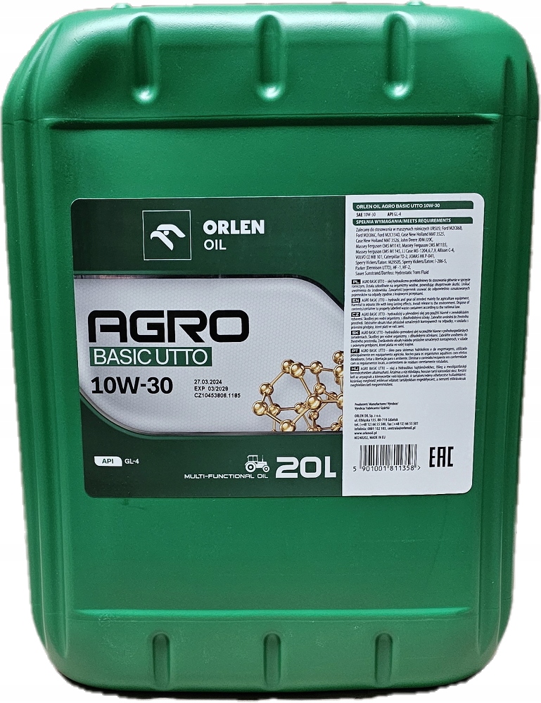 ORLEN AGRO BASIC UTTO 10W30 — высококачественное многофункциональное гидравлическое и трансмиссионное масло. Современный, уникальный состав специально подобранных минеральных основ и рафинирующих присадок позволяет удовлетворить современные конструктивные требования производителей сельскохозяйственной техники. Масло обеспечивает отличную противоизносную и антикоррозионную защиту, совместимо с различными уплотнительными материалами.