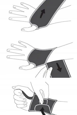 - Вставьте большой палец в отверстие гладкой стороной материала внутрь. Наденьте ремешок на тыльную сторону руки.
