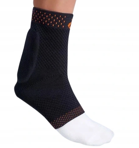 Ортез изготовлен из плоскотканого эластичного материала с учетом анатомического строения, переплетение материала по краям менее сжимающее, что снижает риск отечности и сосудистого стаза, часть, закрывающая пятку, имеет меньшую силу сжатия; сухожильная вставка снижает напряжение мышц и связок и посредством массажа стимулирует улучшение кровообращения в области, к которой она прилегает во время движений в суставе.