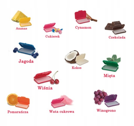вишня, жевательная резинка, черника, ананас, мята, сладкая вата, апельсин, кокос, шоколад, виноград, тутти фрутти