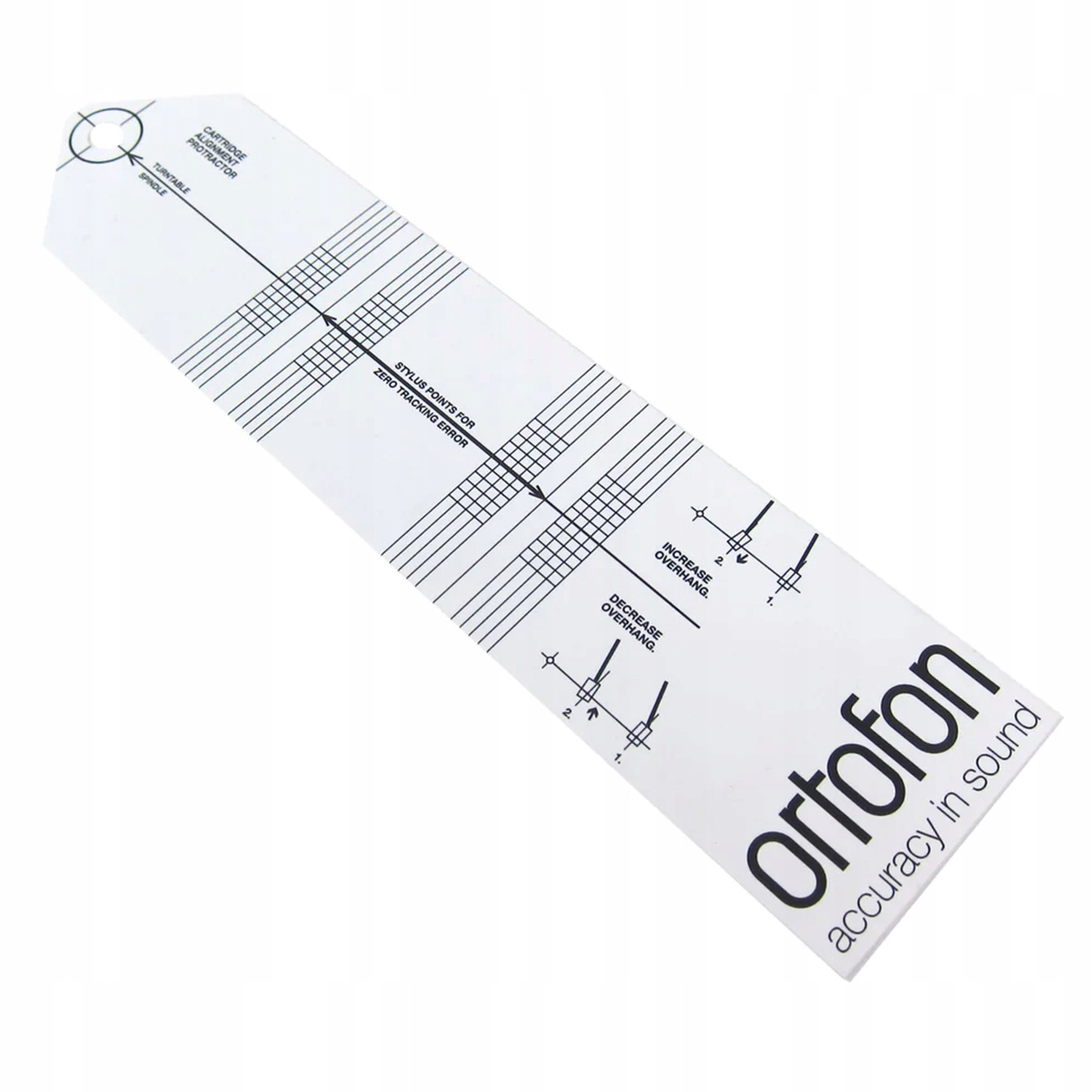 Шаблон – это пластиковый шаблон, на котором нулевая точка(и) ) и линии — это напечатанные контакты, напротив которых должна располагаться вставка. Шаблон надевается на шпиндель проигрывателя пластинок (это становится возможным благодаря отверстию размером с булавку, просверленному в шаблоне) и устанавливается на опорный диск.