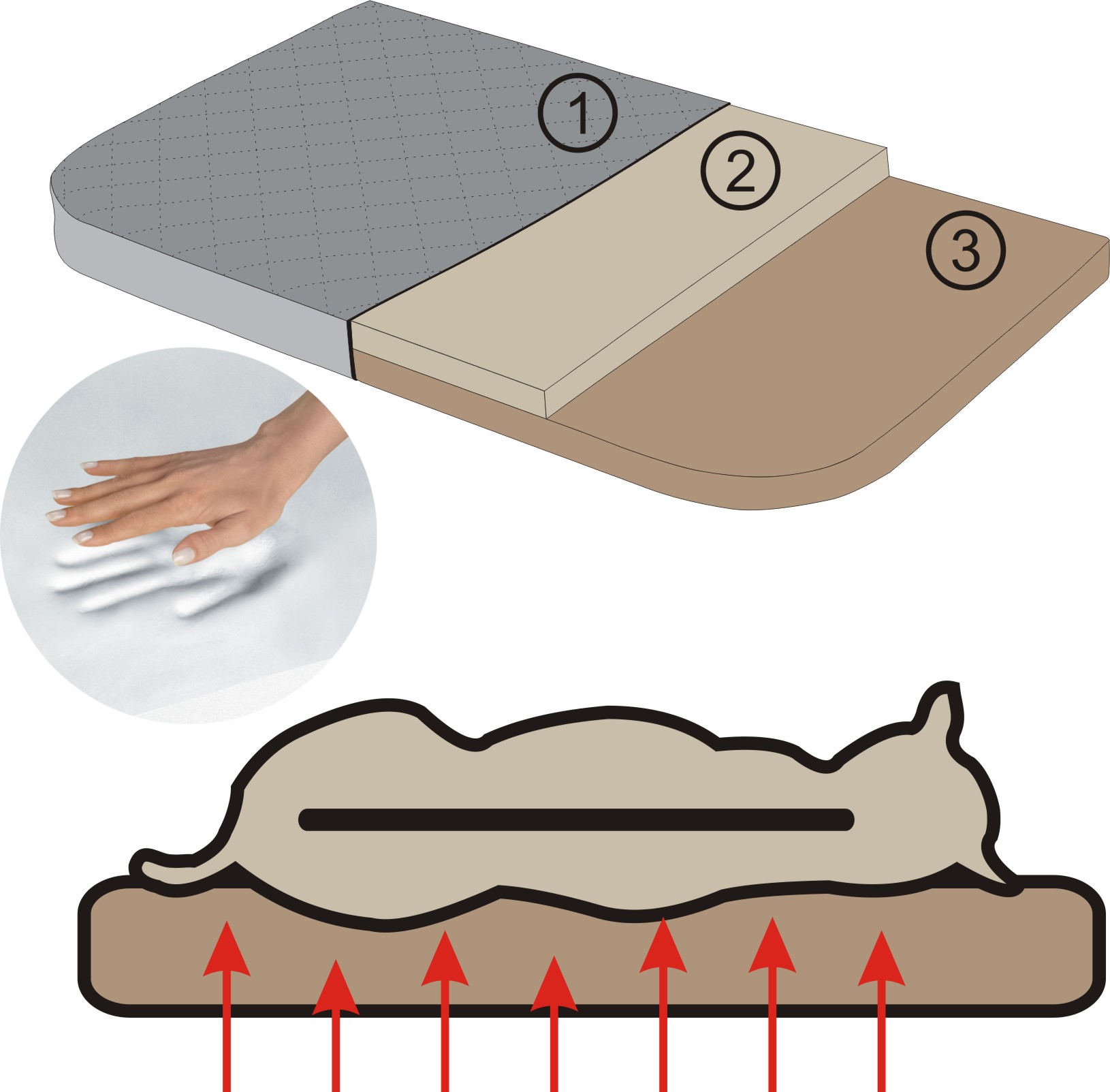 - ОРТОПЕДИЧЕСКИЕ СВОЙСТВА - матрас кровати состоит из двух поролонов: полиуретана (3) -3 см и виско с памятью формы (2) -3 см. Виско благодаря своим свойствам адаптируется к телу животного, благодаря чему позвоночник сохраняет прямую линию.
