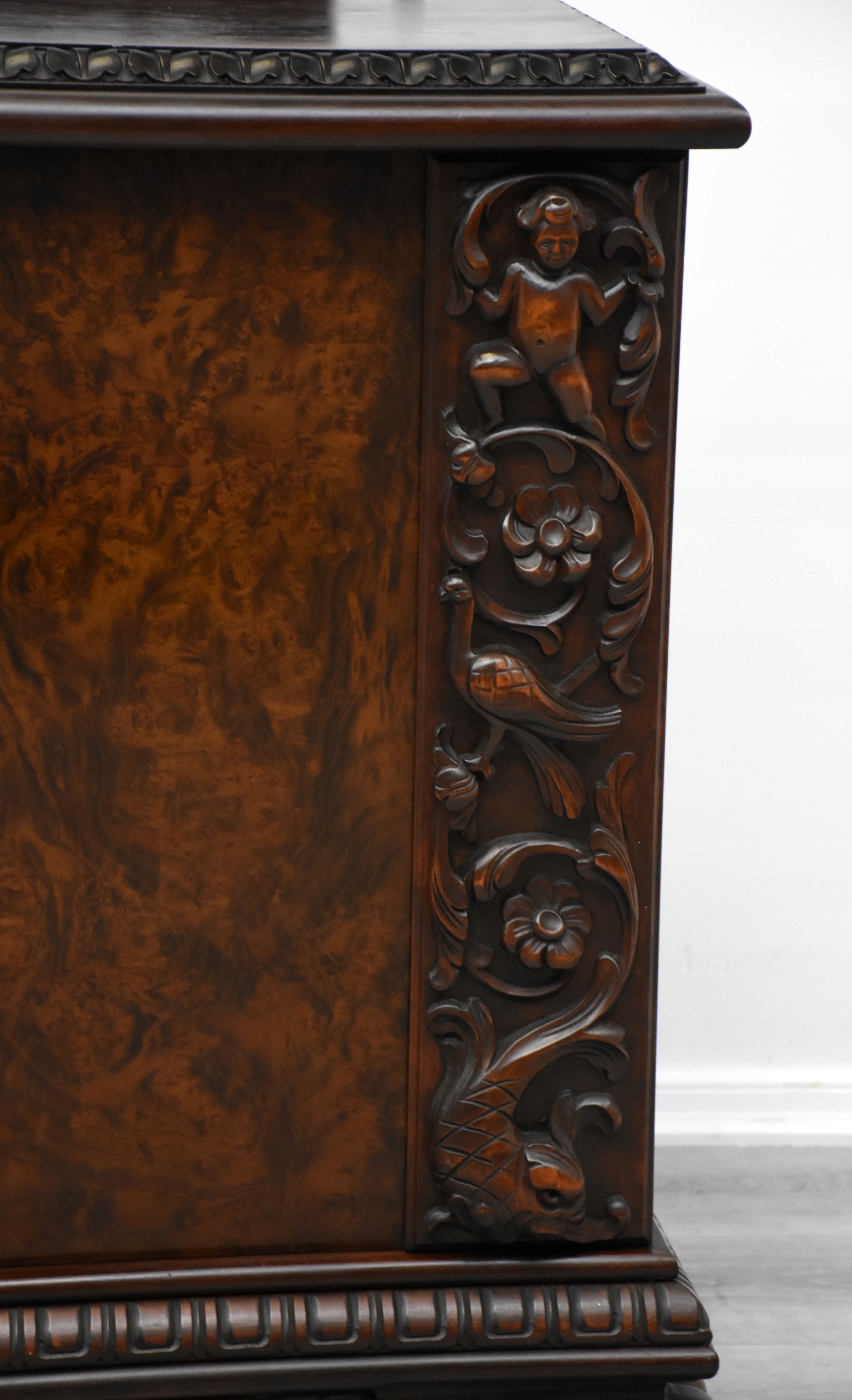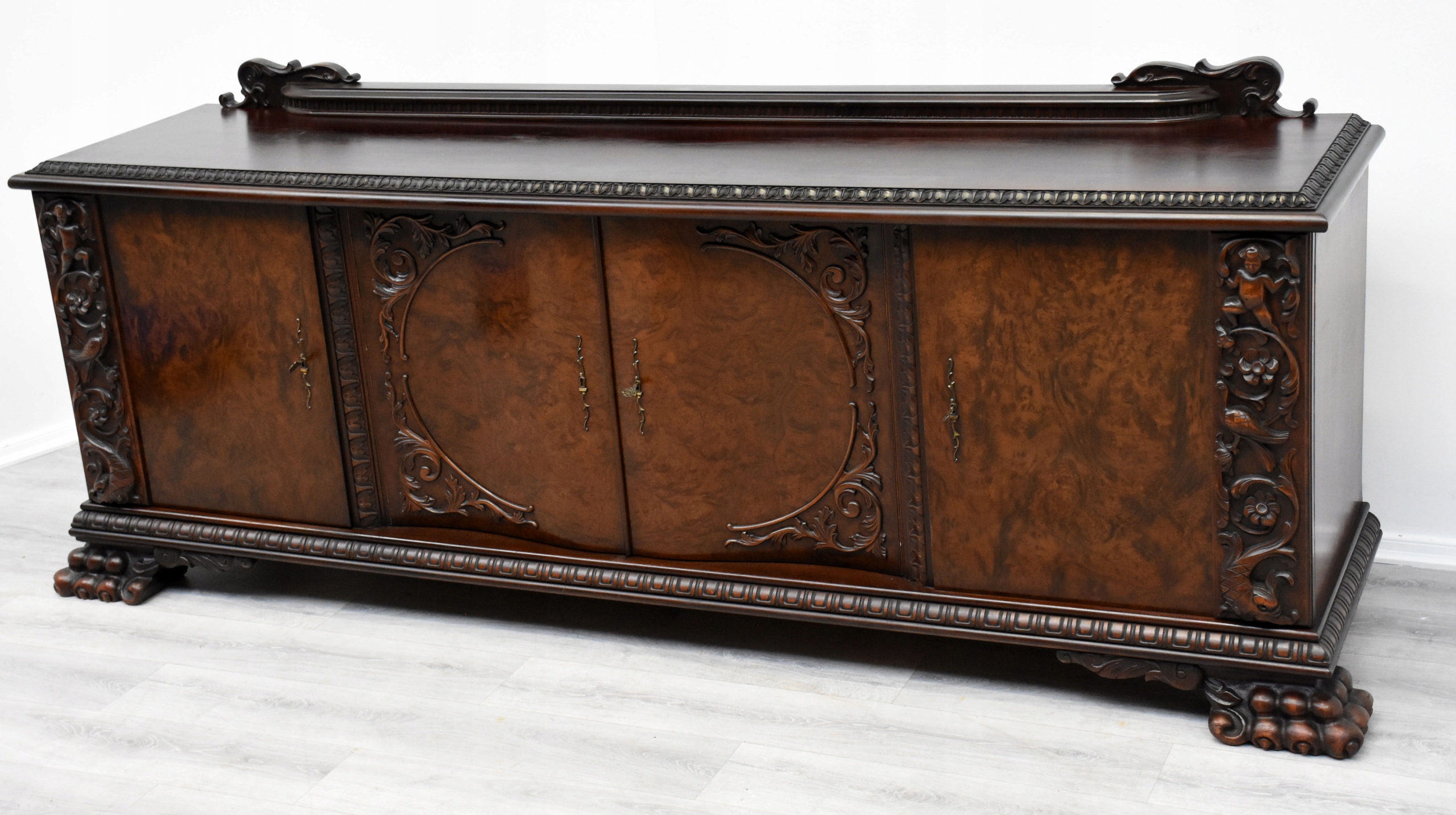 ORZECHOWA KOMODA NEORENESANSOWA, LWIE ŁAPY h91x262x63cm