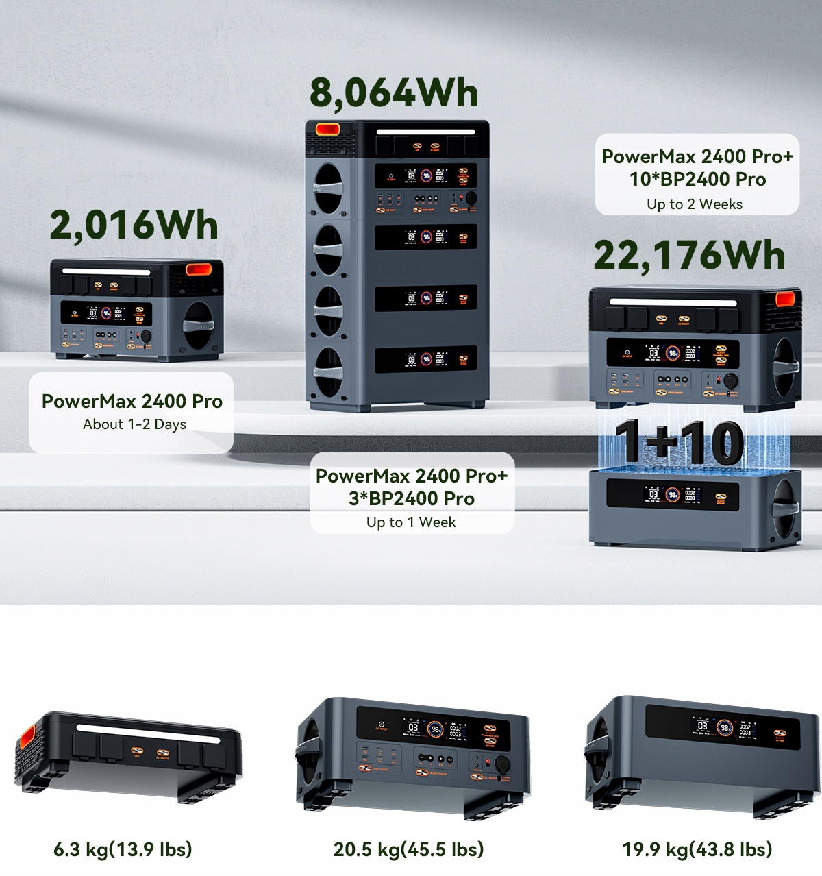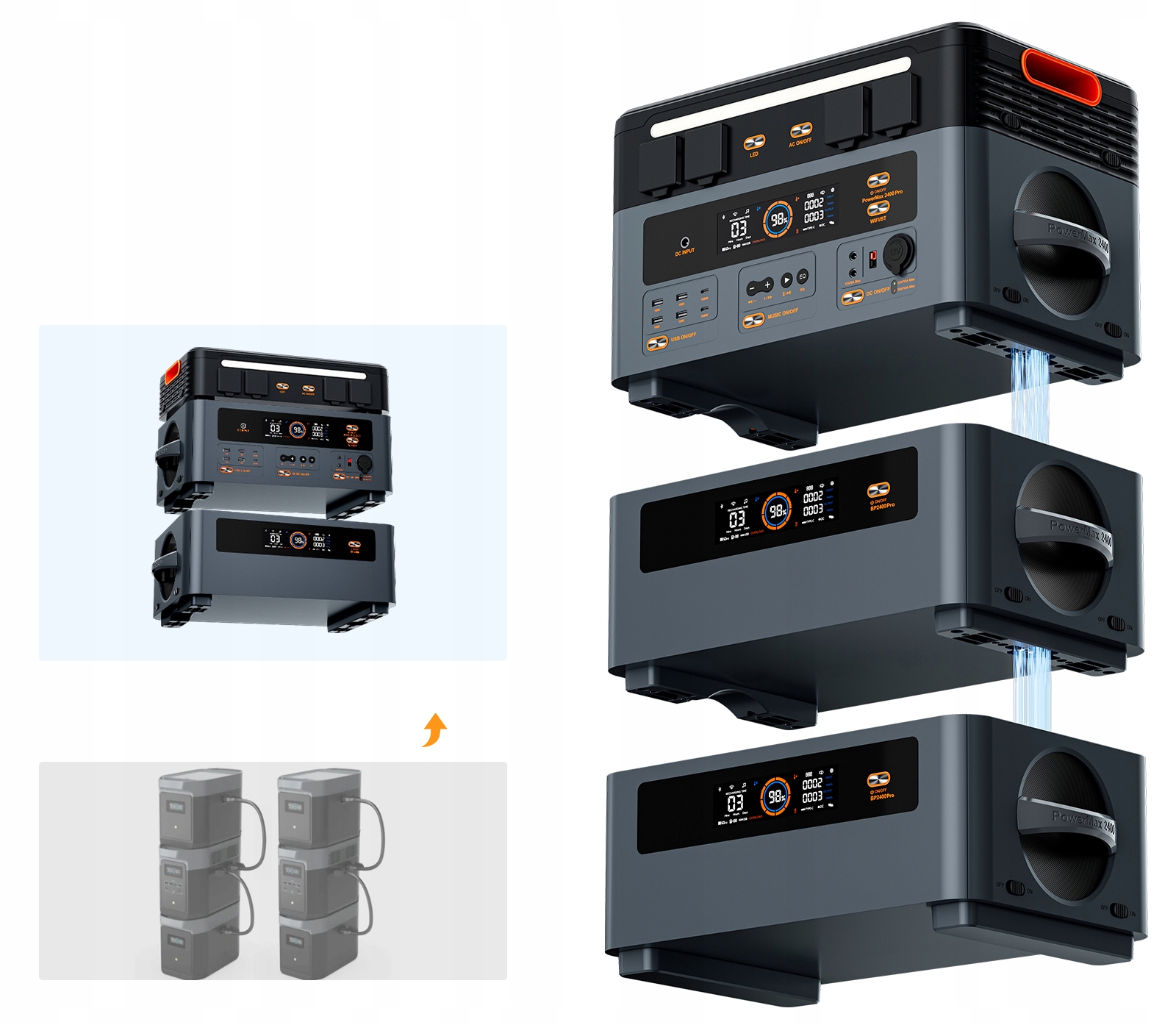 Благодаря бесшовной конструкции стекирования без использования кабелей OSCAL BP2400 Pro легко подключается к PowerMax2400 Pro или другим устройствам BP2400 Pro, позволяя вам наслаждаться беспрепятственной установкой, одновременно повышая эффективность использования пространства, надежность и организацию.