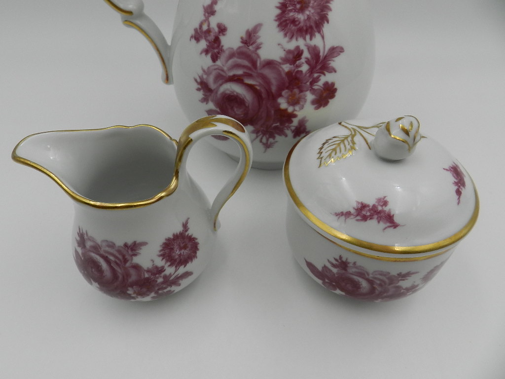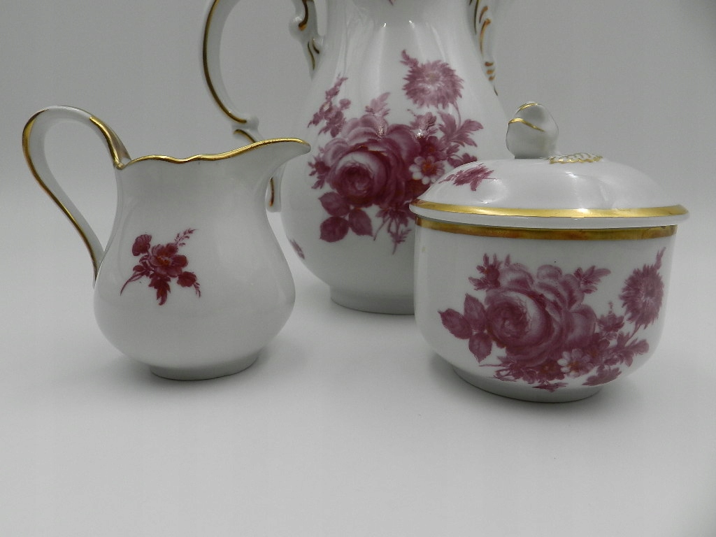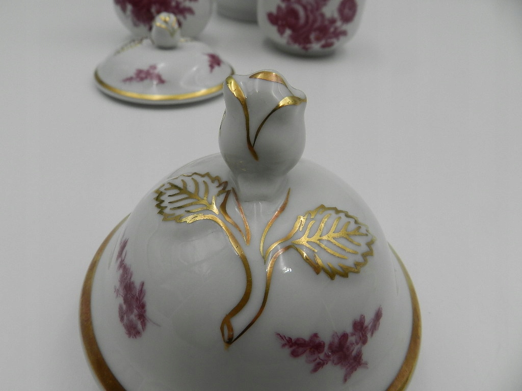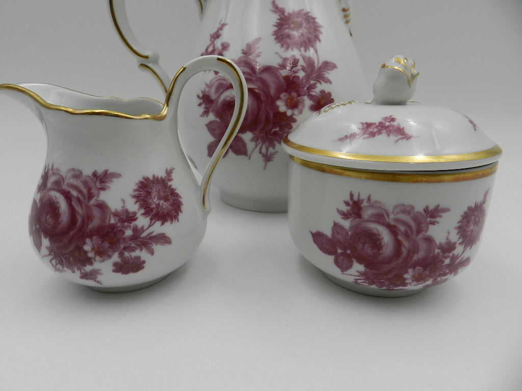 Особого внимания заслуживают необыкновенно красивые вершины крышки кувшина и сахарницы в форме розы, а также тонкая и деликатная позолота экспоната.