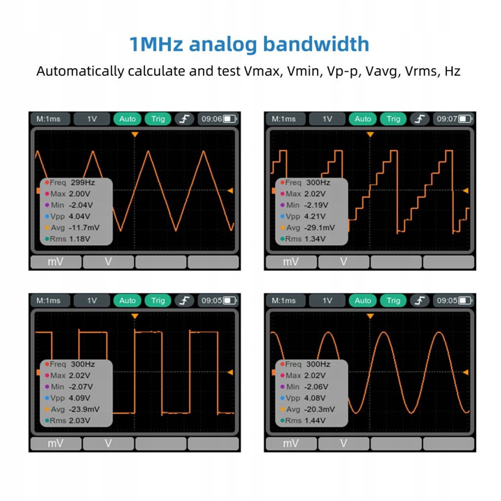 3. Расширенные функции осциллографа: аналоговая полоса пропускания 1 МГц и максимальная частота дискретизации 5,0 мс, что обеспечивает форму сигнала высокого разрешения для детального анализа.