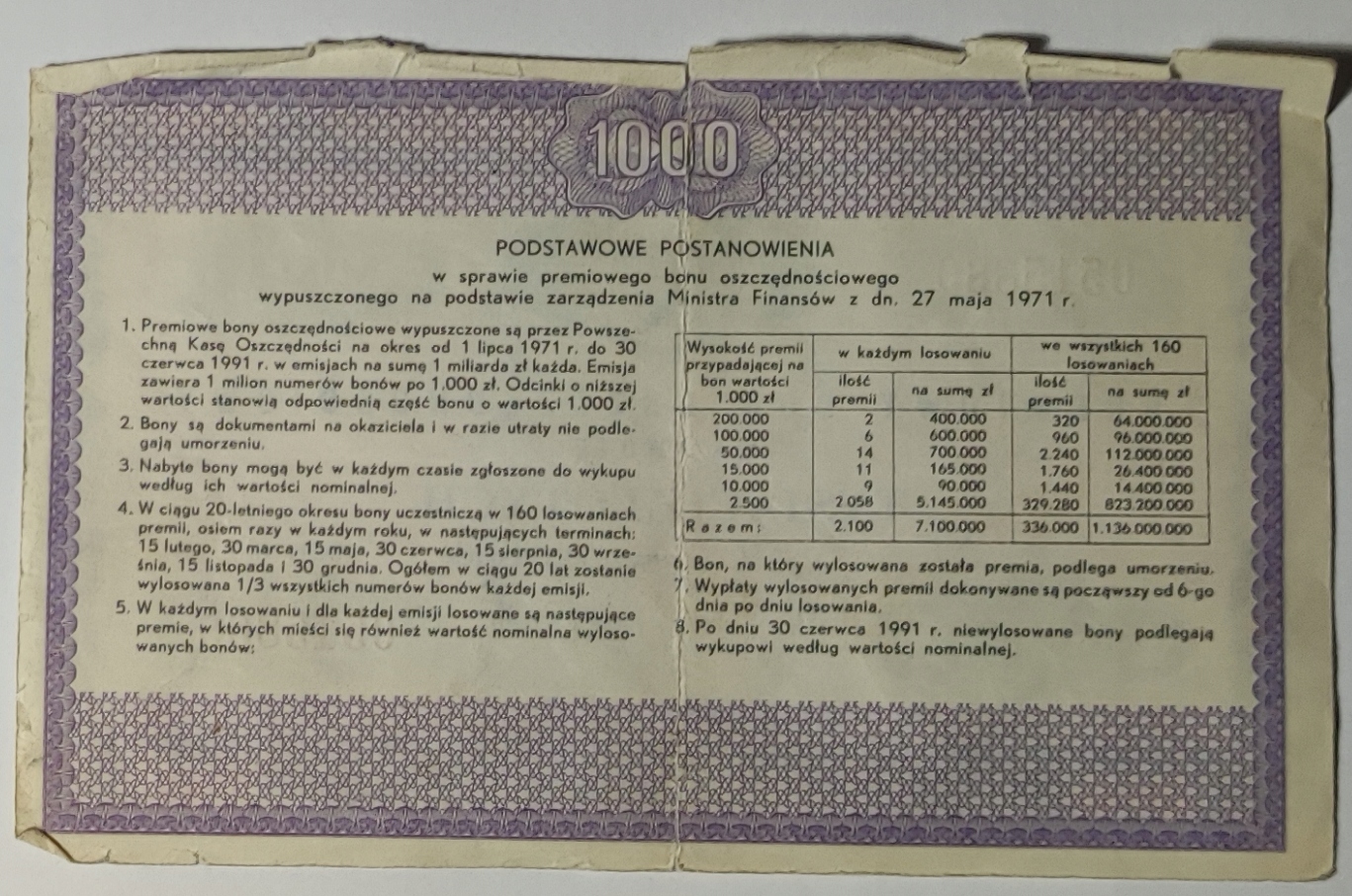 Премиальный сберегательный ваучер PKO на 1000 злотых 1971 года, PRL Варшава