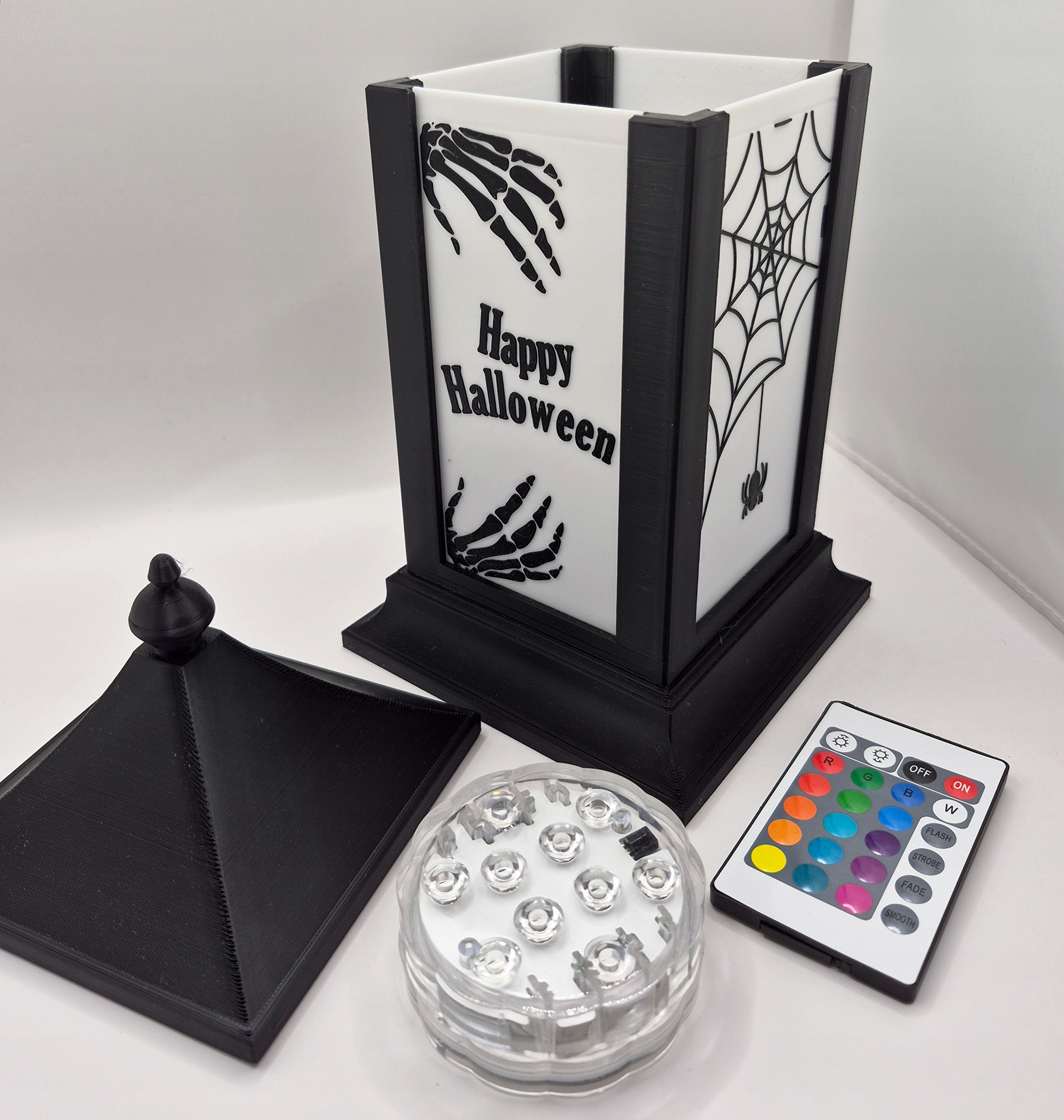 Элегантный 3D-фонарь для украшения осени и Хэллоуина. Корпус напечатан из PLA, а полупрозрачные панели прекрасно рассеивают светодиодный свет с возможностью менять цвета (пульт и батарейки в комплекте). Крыша съемная - легкий доступ к свету/батарее.