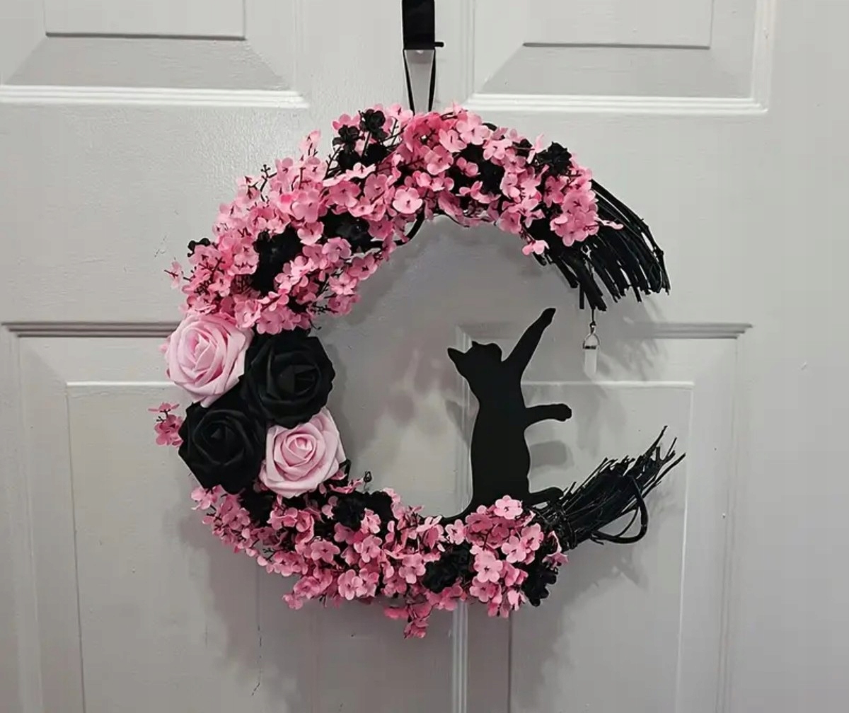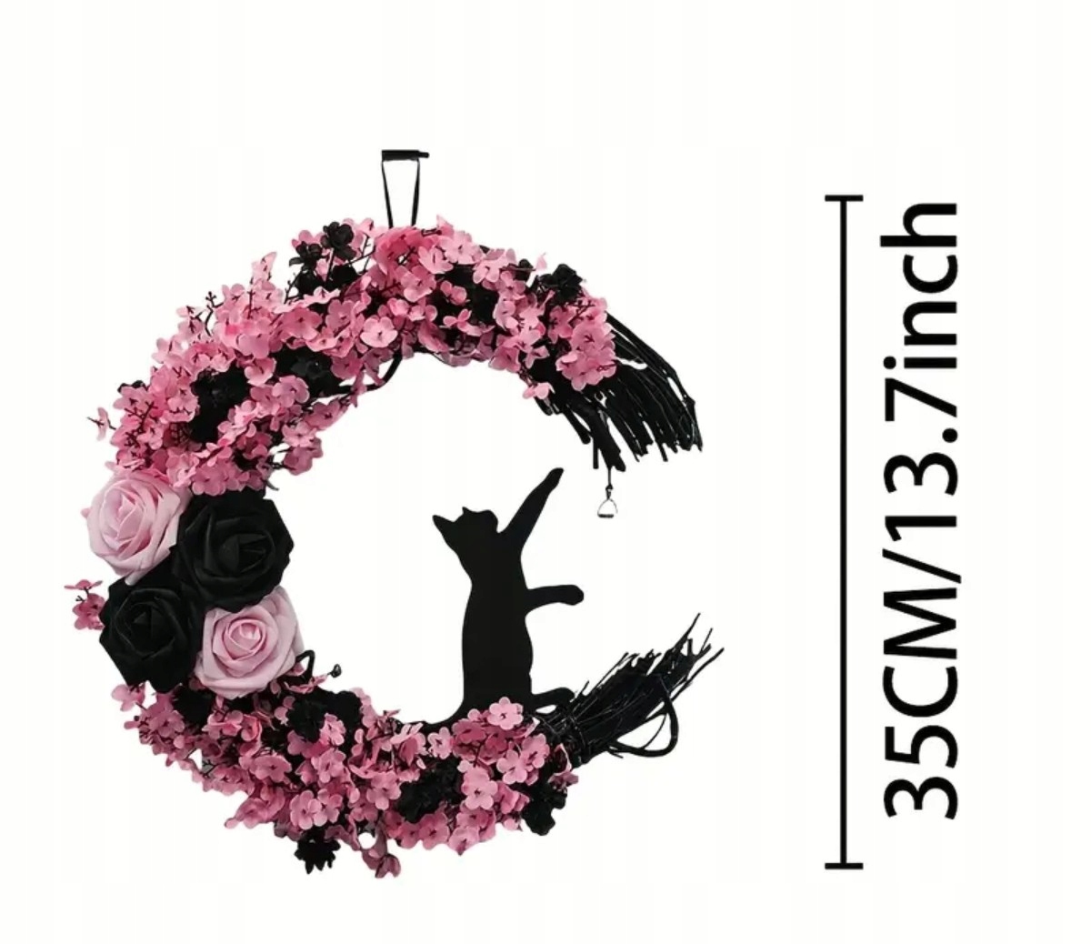 Венок изготовлен с большой осторожностью - он сочетает в себе очарование осенних цветов, нежные розовые и черные цветы и фигуру кошки, которая дает всю ноту тайны и уникальную атмосферу. Благодаря этому это украшение, которое идеально подходит для атмосферы осени и Хэллоуина.