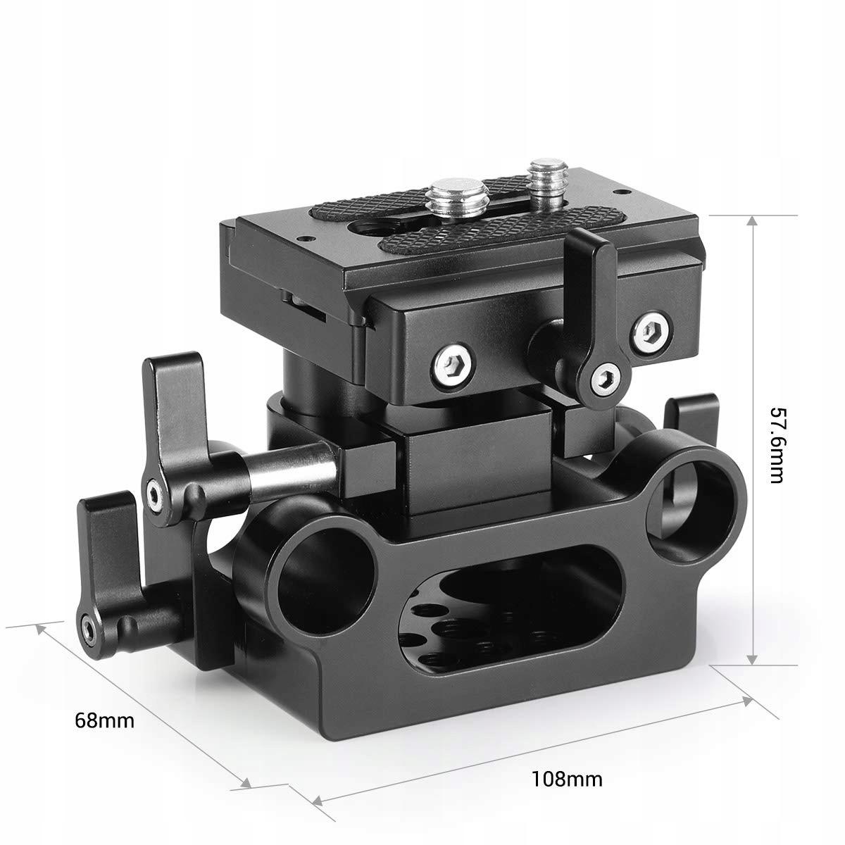 - [зажим 15 мм]. Основание имеет 15 -мм стержень и может взять стержень Smallrig 15 мм 1053, к которому вы можете прикрепить аксессуары, такие как ручка линзы Smallrig 2152, Smallrig 2077 выпуск наплечника, так что расстояние между двумя стержнями и центром линзы составляет 85 мм. Просто открутите гайку бабочки сбоку, отрегулируйте высоту и затяните гайку бабочки