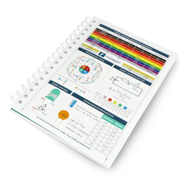Курс «Основы электроники» от FORBOT составляет более 130 страниц формата В5 (тетрадь большего размера), которые скреплены металлической спиралью, что делает пользование изданием гораздо удобнее, чем склеенной книгой. Весь курс напечатан в цвете (цветные рамки, заголовки, фотографии, иллюстрации и диаграммы). Если у вас возникли проблемы с выполнением упражнений, вы можете воспользоваться онлайн-версией курса, позволяющей увеличить все фотографии и иллюстрации.