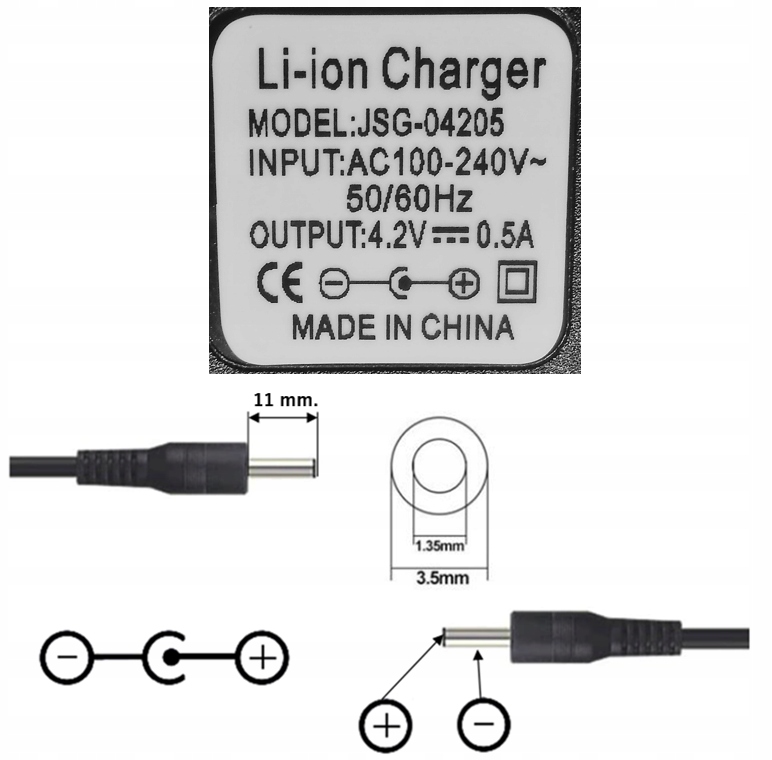 - 4,2В . 0,5А. - штекер: 3,5 мм. х 1,35 мм.