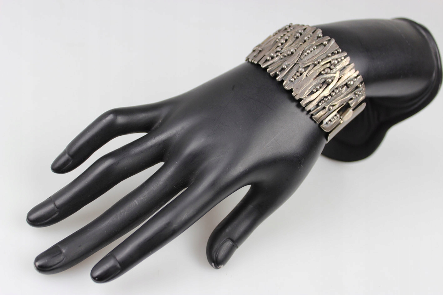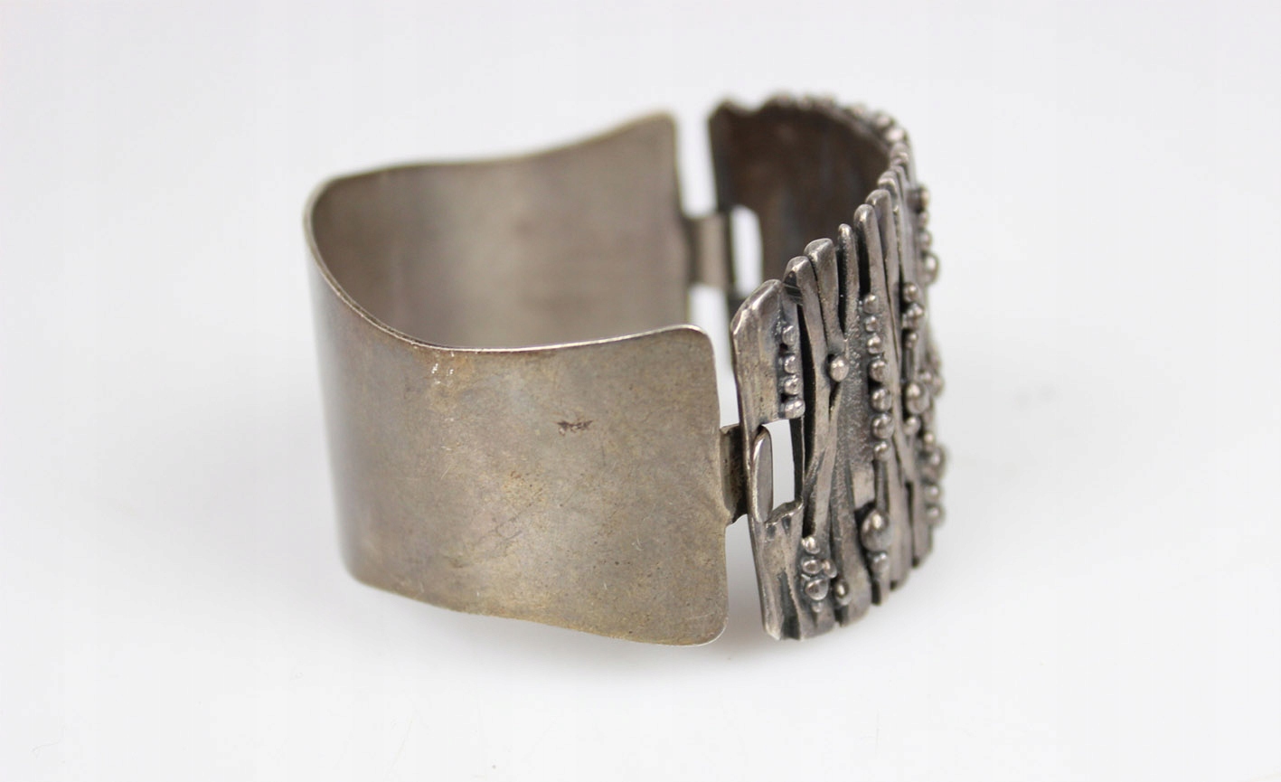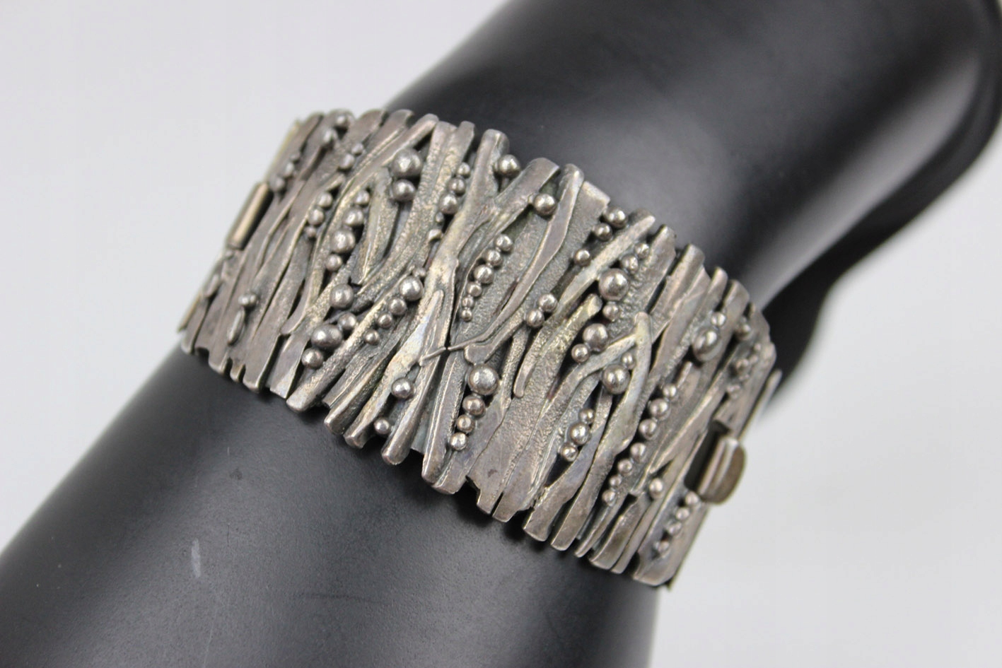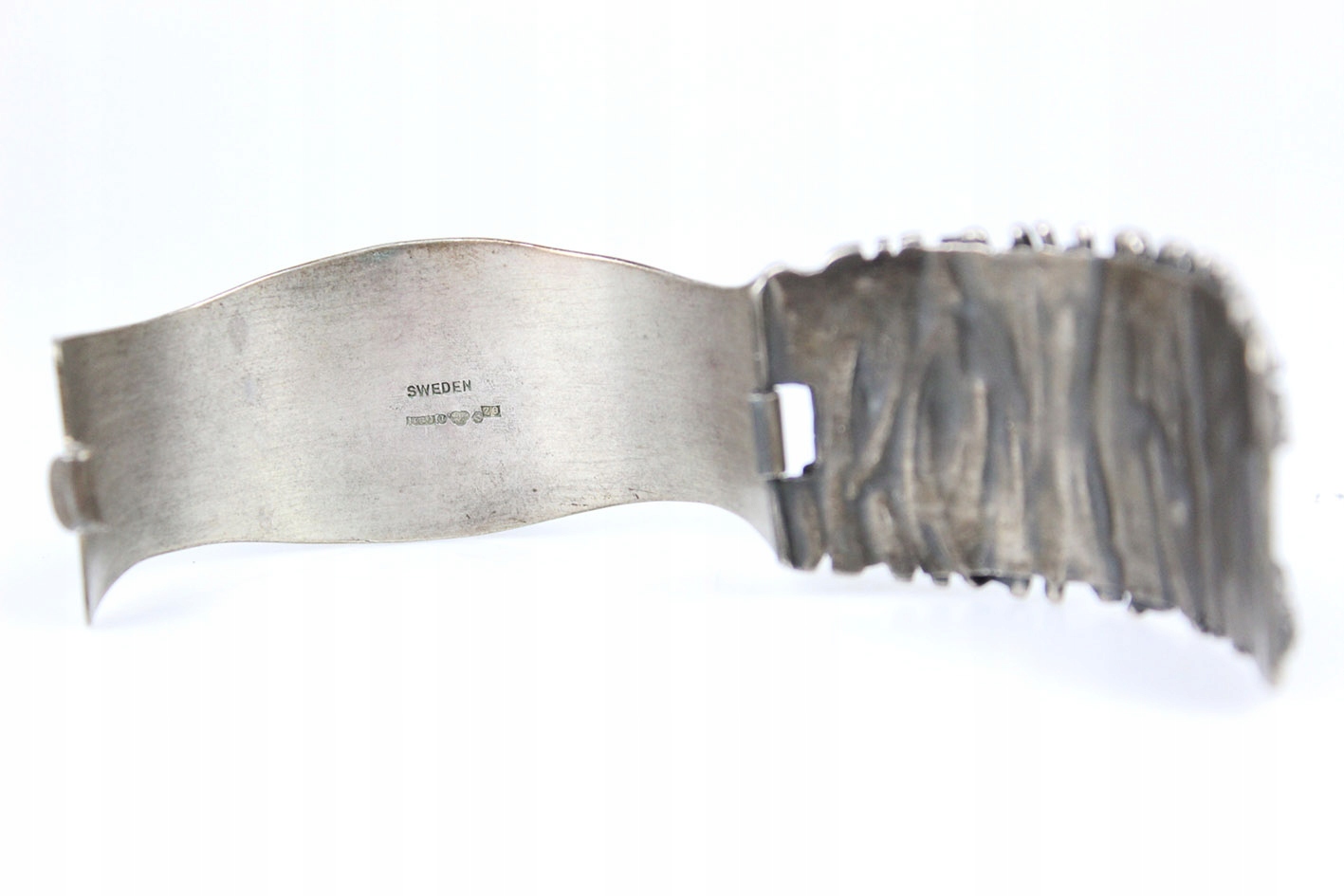 Шведский браслет из серебра, подписанный полным набором шведских точек. Изделие массивной, закрытой формы, с широкой верхней половиной, оформленной в рельефной технике - поверхность браслета состоит из неровных, вертикальных полос и сферических аппликаций, создающих абстрактный мотив, напоминающий структуру корней или морских водорослей. Сырой, органичный оттенок, типичный для шведского модернизма 1960–70-х годов. Сохранилась в очень хорошем состоянии, с красивой натуральной патиной, подчеркивающей рельеф поверхности.