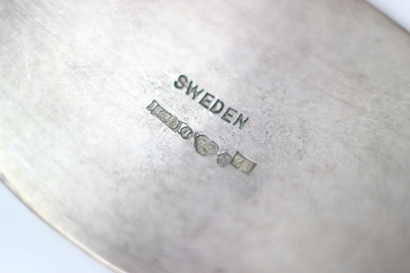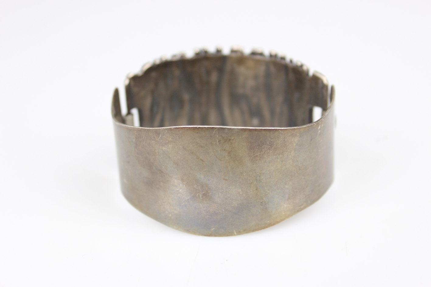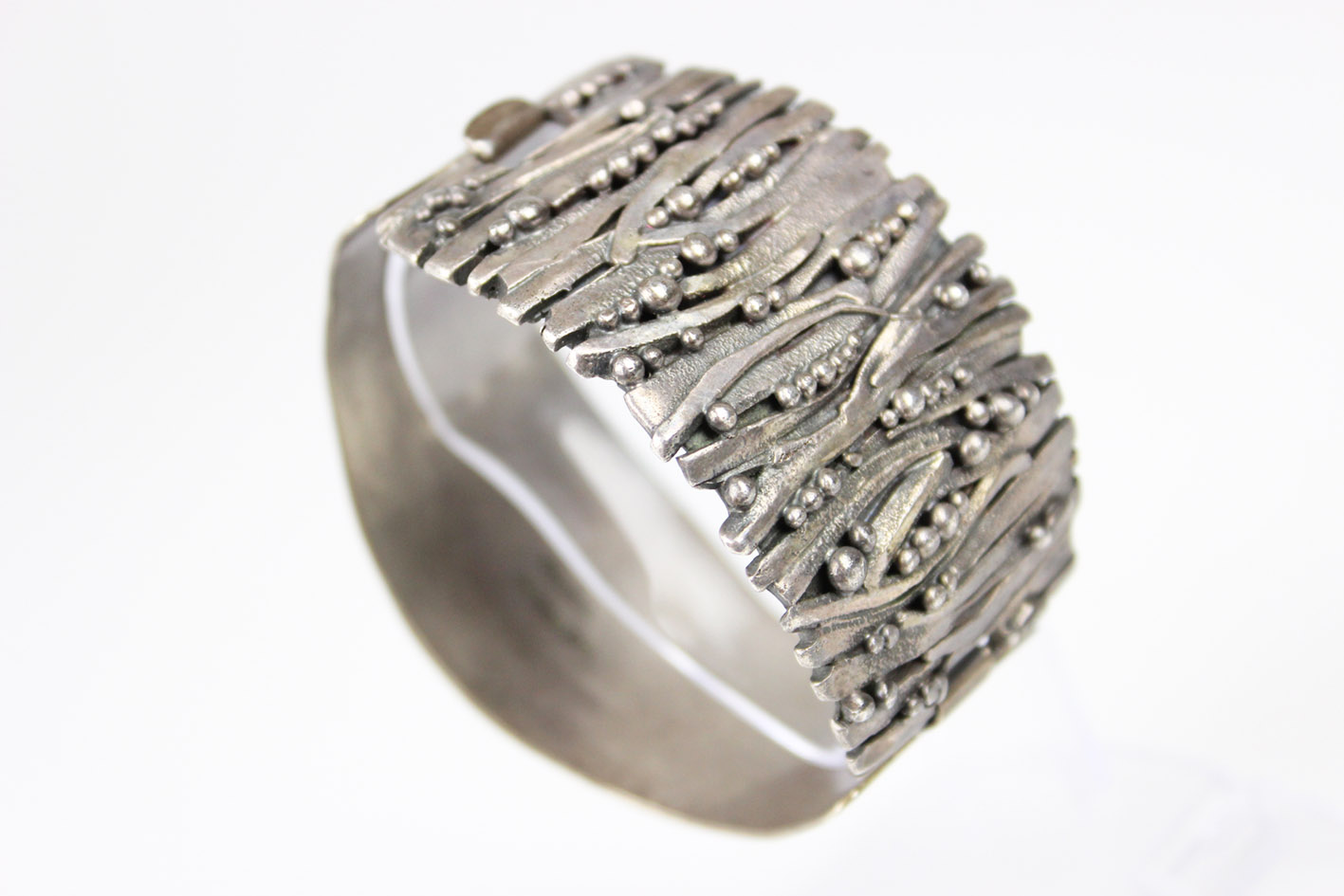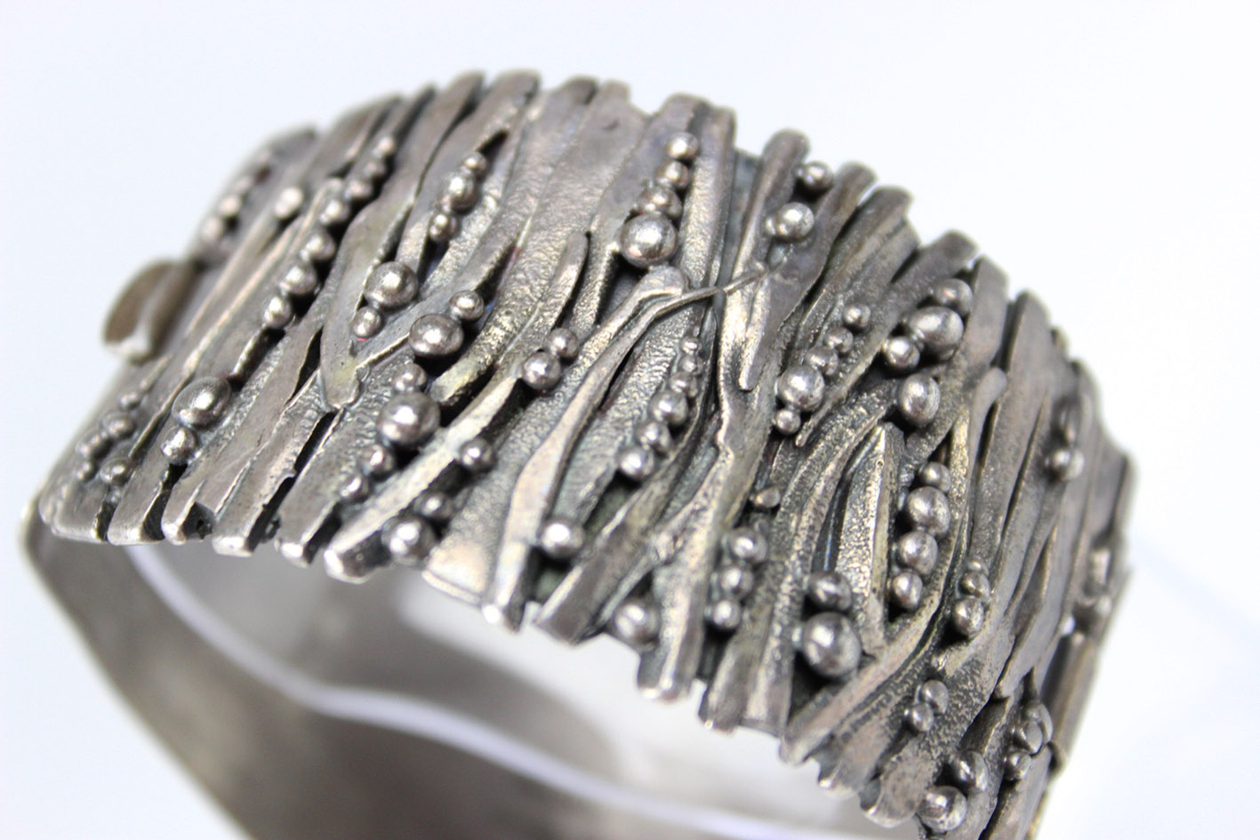 Шведский браслет из серебра, подписанный полным набором шведских точек. Изделие массивной, закрытой формы, с широкой верхней половиной, оформленной в рельефной технике - поверхность браслета состоит из неровных, вертикальных полос и сферических аппликаций, создающих абстрактный мотив, напоминающий структуру корней или морских водорослей. Сырой, органичный оттенок, типичный для шведского модернизма 1960–70-х годов. Сохранилась в очень хорошем состоянии, с красивой натуральной патиной, подчеркивающей рельеф поверхности.