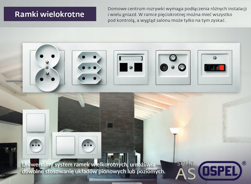OSPEL AS – это высококачественное электромонтажное оборудование. Широкий ассортимент выключателей и розеток всех типов способен удовлетворить самый изысканный вкус. Независимо от типа освещения, использование оборудования OSPEL облегчает монтаж, повышает безопасность и открывает совершенно новые коммунальные возможности. Оборудование ОСПЭЛ адаптировано к каркасной системе. Серия As предназначена для скрытого монтажа в стандартной коробке Ø60.