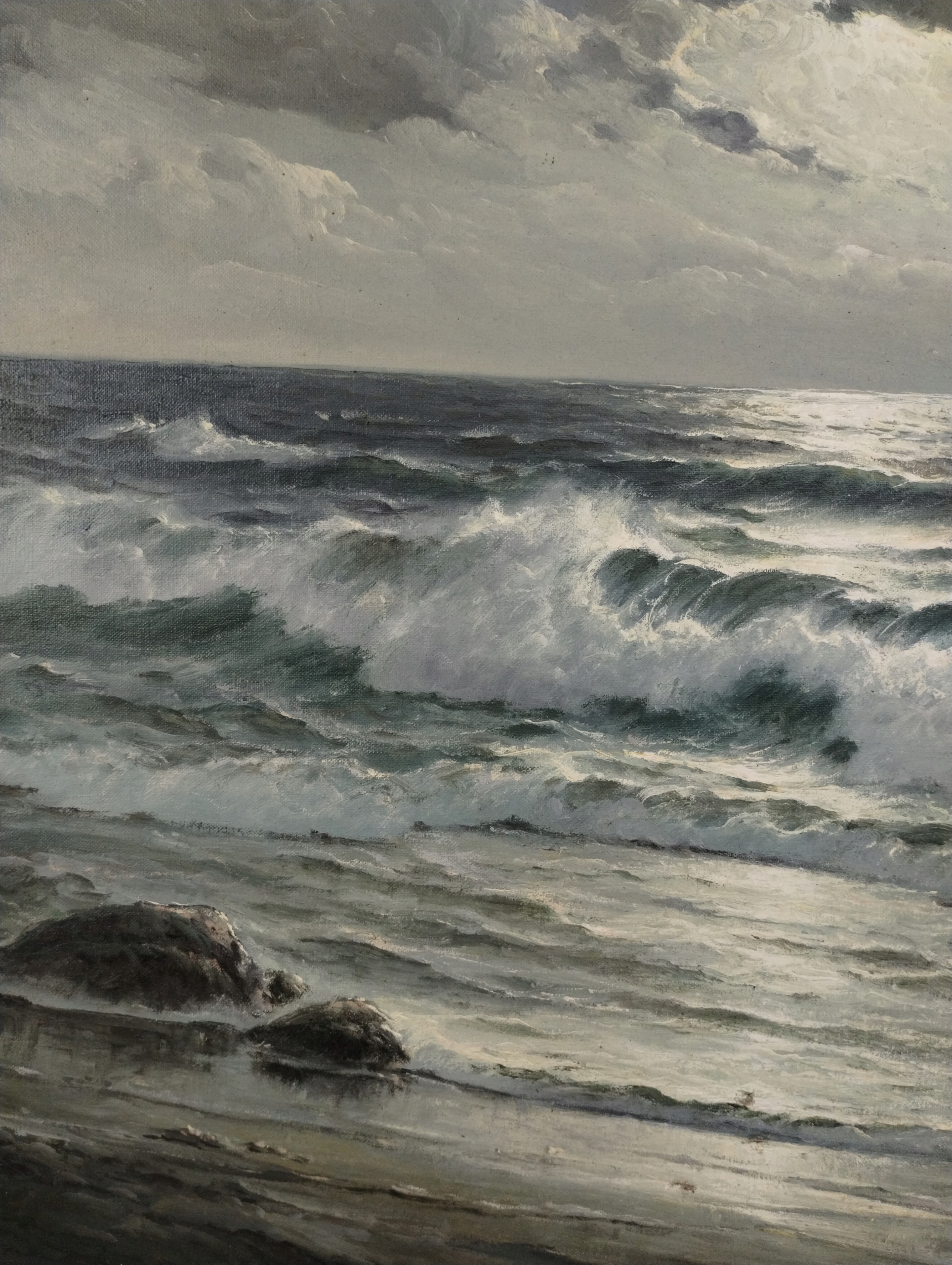 Картина написана на холсте, закрепленном на деревянном подрамнике. Сама картина в хорошем состоянии, серьезных повреждений и загрязнений на картине нет.
