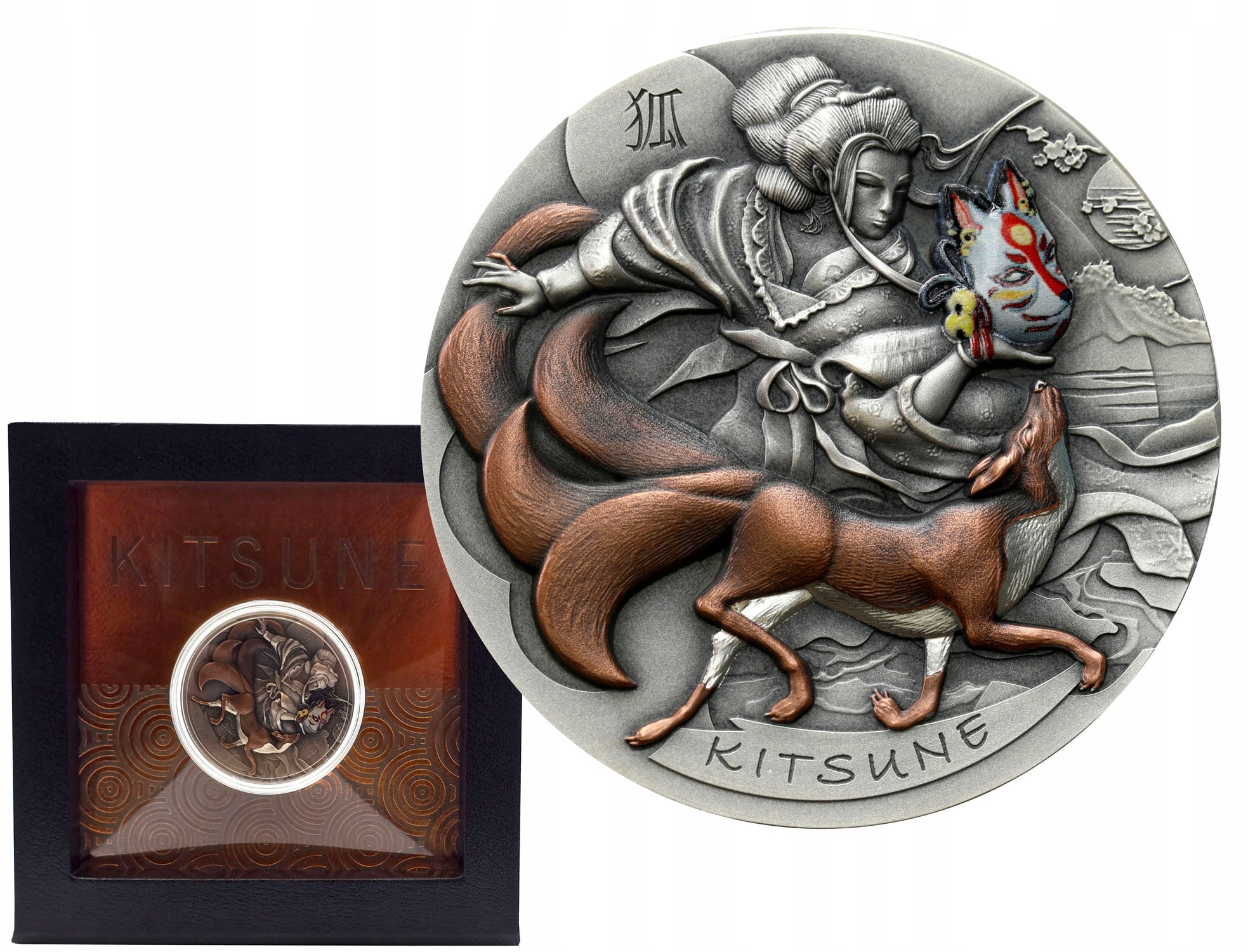 , который получает большую власть с количеством хвостов. Его считали божественным посланником, который мог принять форму человека, предметов и даже целых пейзажей, чтобы выполнить свои миссии. Монета, вдохновленная этой легендой, представляет собой уникальную работу, которая опирается на эстетику цветущей страны