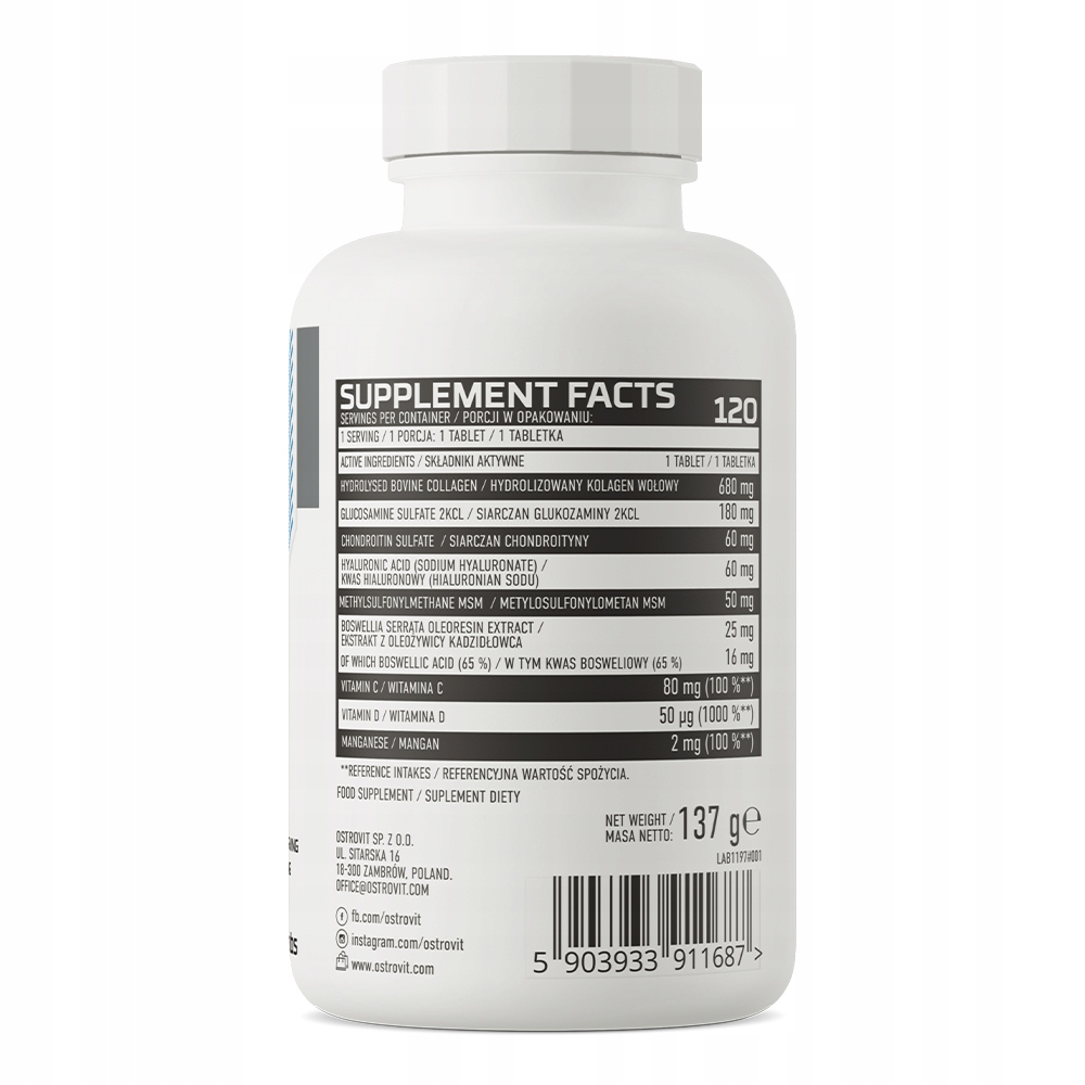 Просматривая «OstroVit Flex Regen 120 таб. ДЛЯ СУГЛОБІВ МСМ КОЛАГЕН», вы можете быть уверены, что данный товар из каталога «Суставы, кости, мышцы» будет доставлен из Польши и проверен на целостность. В цене товара, указанной на сайте, учтена доставка из Польши. Внимание!!! Товары для Евросоюза, согласно законодательству стран Евросоюза, могут отличаться упаковкой или наполнением.