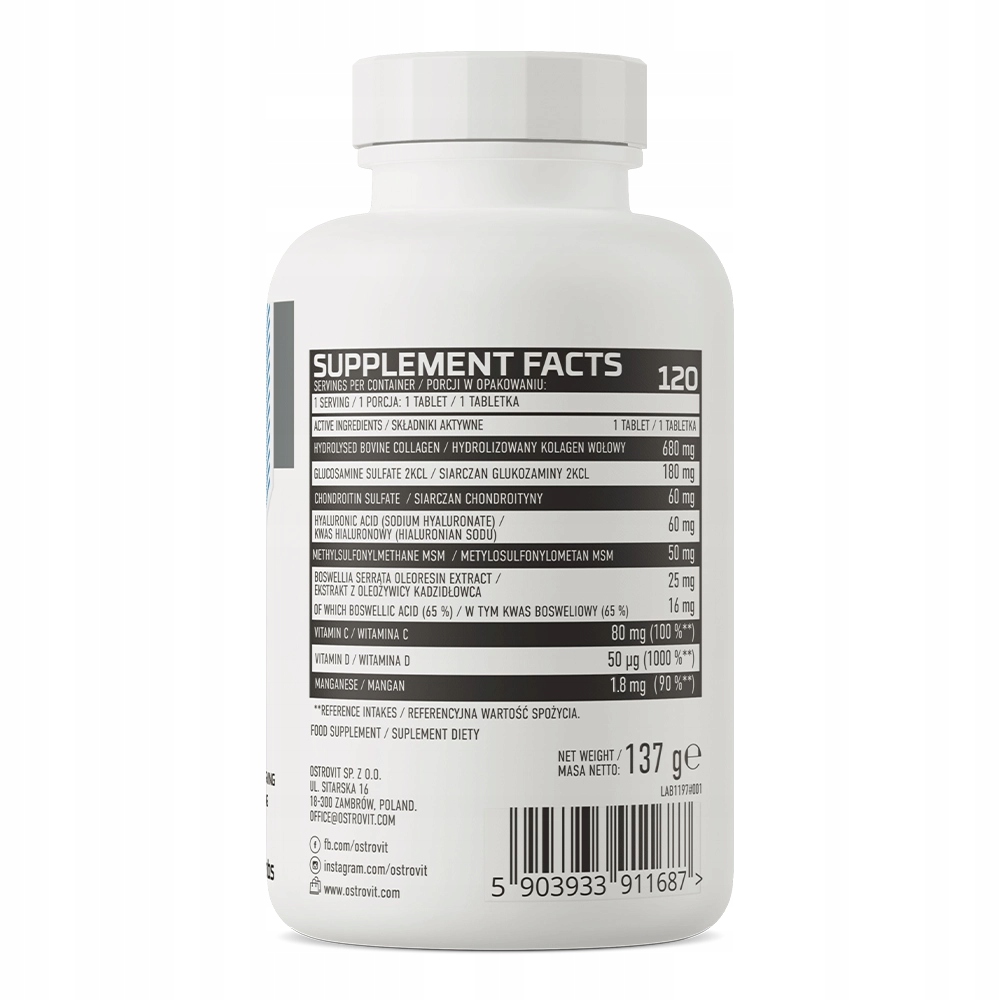 Ингредиенты Гидролизованный бычий коллаген, 2KCL сульфат глюкозамина (содержит моллюски), L-аскорбиновая кислота (витамин С), хондроитинсульфат , гиалуроновая кислота (гиалуронат натрия), метилсульфонилметан, экстракт ладана - 65% босвеллиевая кислота, холекальциферол (витамин D), антислеживатели: диоксид кремния, магниевые соли жирных кислот; бисглицинат марганца (марганец). Продукт может содержать молоко (в том числе лактозу), сою, арахис, другие орехи, семена кунжута, злаки, содержащие глютен, яйца, рыбу.