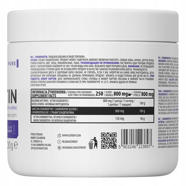 ОстроВит Хондроитин — это порошкообразная пищевая добавка, дополняющая ежедневный рацион хондроитином, который отвечает за правильную регенерацию хряща. Дефицит хондроитина может привести к повреждению и дегенерации клеток, которые не способен восстанавливаться самостоятельно.регенерация после тяжелых тренировок. Препарат особенно рекомендуется пожилым людям и спортсменам, имеющим травмы. Продукт из линии Supreme Pure Line, в котором вы выбираете только заявленный активный ингредиент. Без ненужных консервантов, антислеживателей и наполнителей.