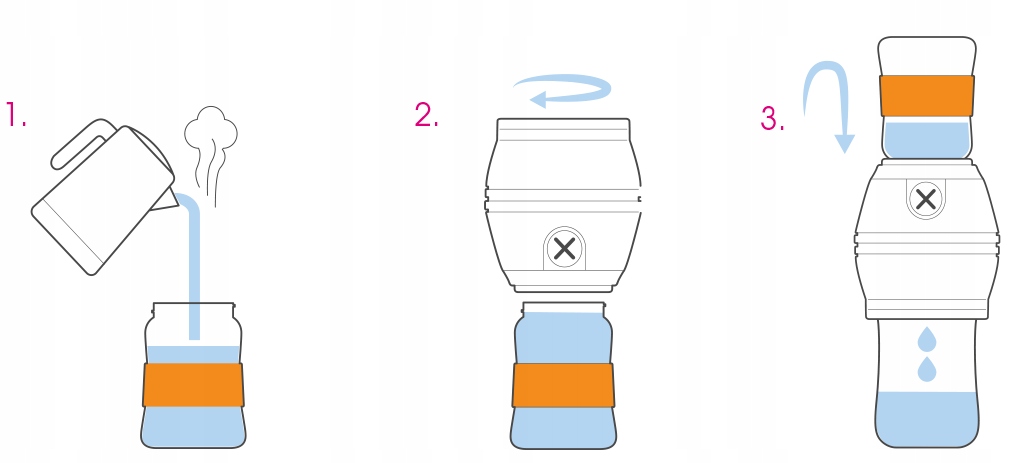 Это обеспечивает алюминиевую спираль внутри, в соответствии с принципом теплообмена. Чтобы сделать это, просто добавьте подходящее количество холодной воды в холодильник, заполните прилагаемый контейнер свежес вареной водой и пропустите воду через него. Благодаря прикрепленному теплоизоляющему силиконовому кольцу вы можете легко коснуться бутылки с горячей водой и прикрутить его к нему прохладное.