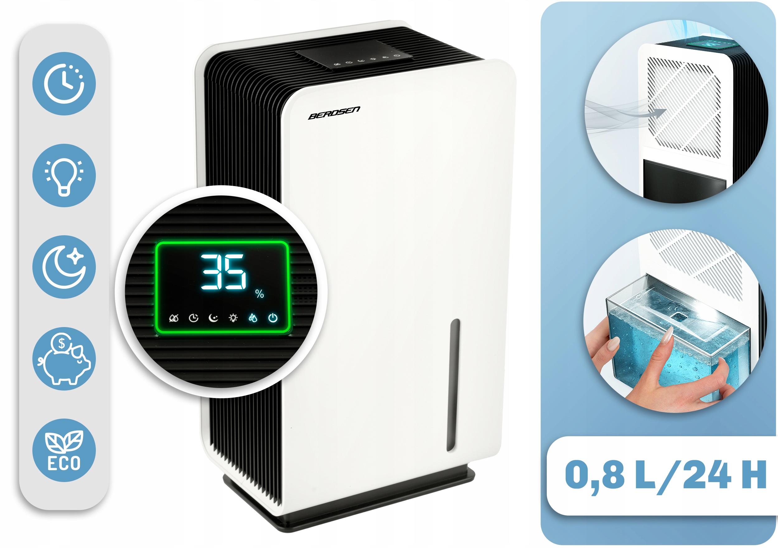 ОСУШИТЕЛЬ ВОЗДУХА АБСОРБЕР ВЛАЖНОСТИ 64 Вт HEPA 34 дБ Berdsen СВЕТОДИОДНЫЙ ТАЙМЕР НОВЫЙ