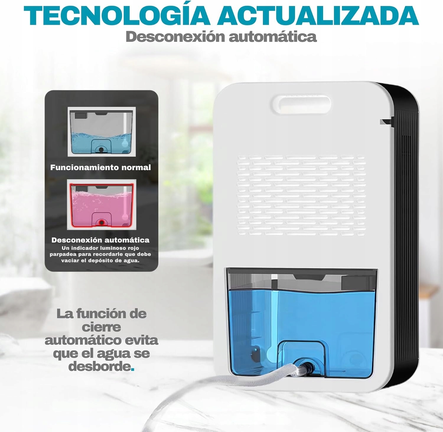 Низкое энергопотребление (90 Вт) делает его экономичным, а бак емкостью 2,4 литра и дополнительный сливной шланг сводят к минимуму необходимость опорожнения вручную.