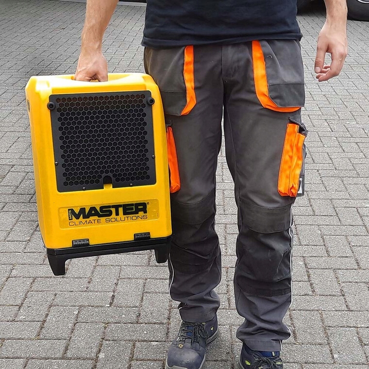 Master DHP 20 осушает воздух методом конденсации. Что это значит: встроенный в устройство вентилятор пропускает забранный из помещения влажный воздух через установленный в устройстве испаритель, понижая его температуру ниже точки росы. Излишек водяного пара выбрасывается в воздух в виде конденсата и собирается в контейнере. После прогревания до комнатной температуры воздух, лишенный лишней влаги, затем снова выпускается наружу. Конденсационное осушение определенно более эффективно и экономично, чем осушение путем отопления и вентиляции, прежде всего за счет исключения воздухообмена внутри помещения.