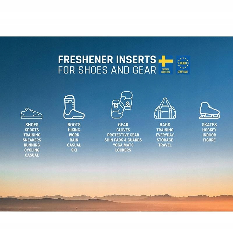 Шведские инновации: разработаны, спроектированы и протестированы в Швеции. Содержит запатентованную смесь бамбукового угля Moso и минералов, которые высушивают и дезодорируют, сохраняя влагу, запах, загрязняющие вещества и бактерии. Насыщен свежим ароматом. Климатически нейтральный, сертифицирован REACH по безопасности и защите окружающей среды и на 100 % нетоксичен.