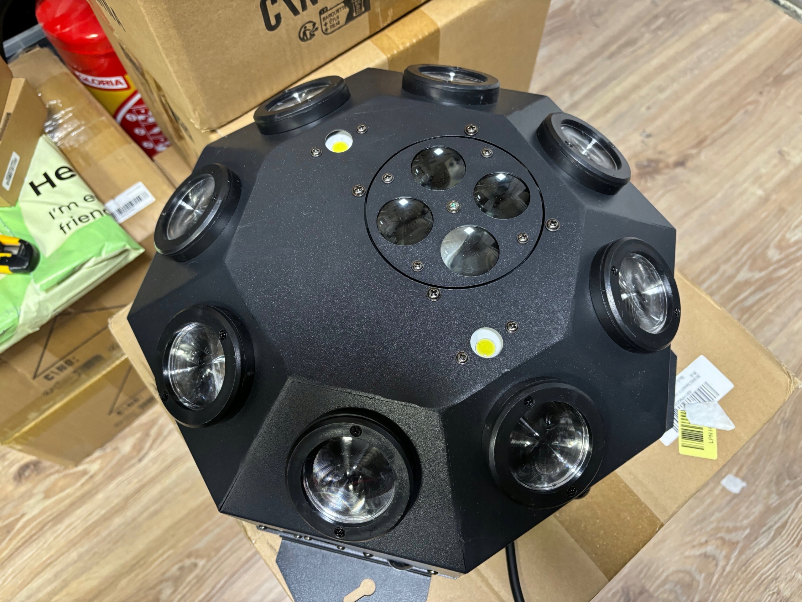 22 светодиодных световых эффекта RGB: цвета светодиодного луча высокой насыщенности, четкое восприятие луча и широкая область освещения, он содержит 8 ярких монохромных световых шариков + 8 монохромных цветных световых шариков + 4 x 4 в 1 светодиодных шариках с рисунком пчелы + 2 белые стробоскопические бусины, которые распространяются по всему объекту.
